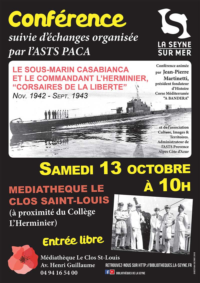 Conférence: « Le Sous-Marin Casabianca et le Commandant L'Herminier, Corsaires de la Liberté », le 13/10/2018