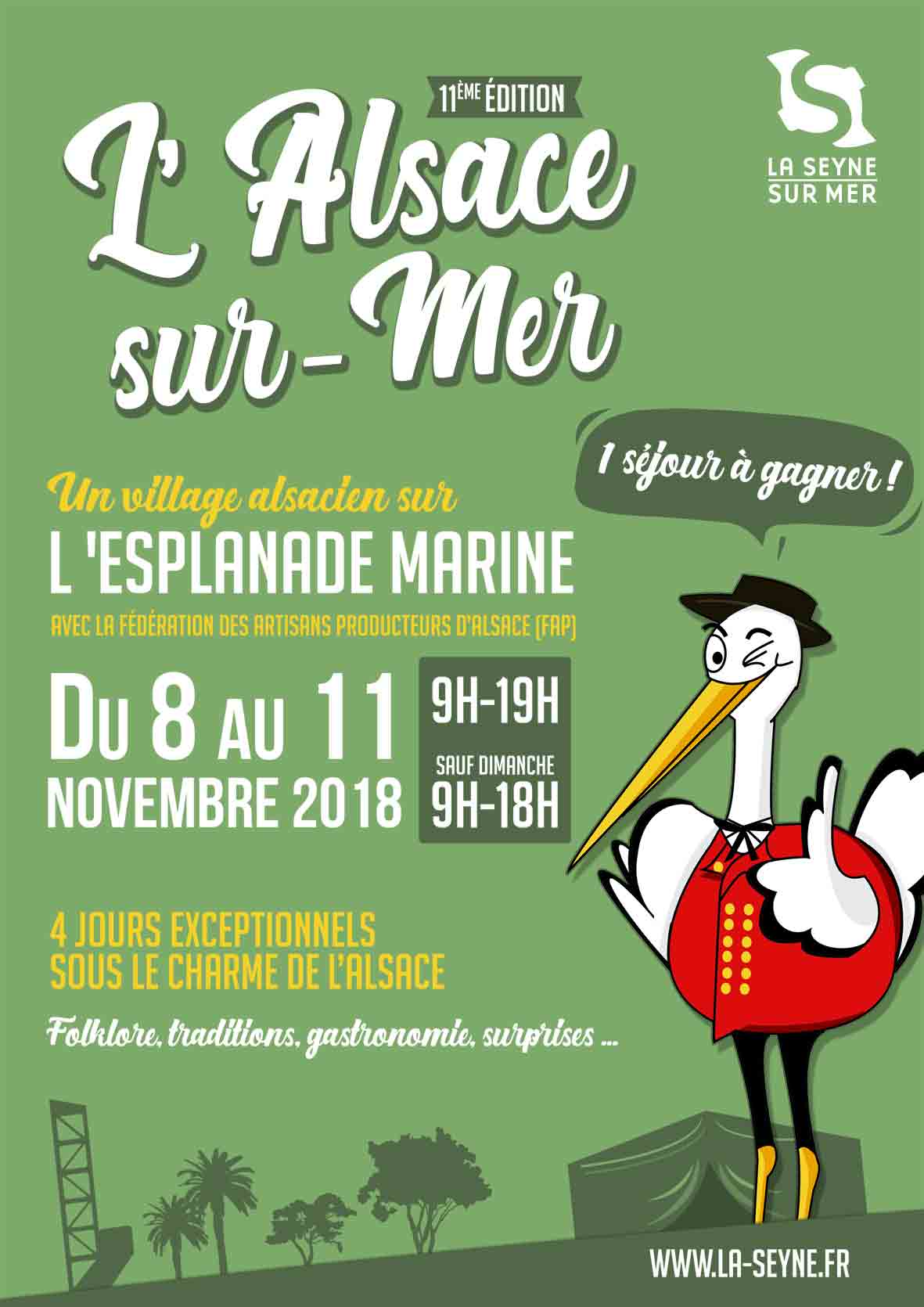 Un village alsacien du jeudi 08 au dimanche 11 novembre 2018 tous les jours de 09:00 à 19:00 sauf dimanche 11 novembre de 09h00 à 18h00 sous le chapiteau de l'Esplanade Marine à La Seyne sur Mer ... Vous êtes conviés à l'inauguration officielle, jeudi 8 novembre 2018 à 11h00 ...plus d'infos - cliquez ici ...