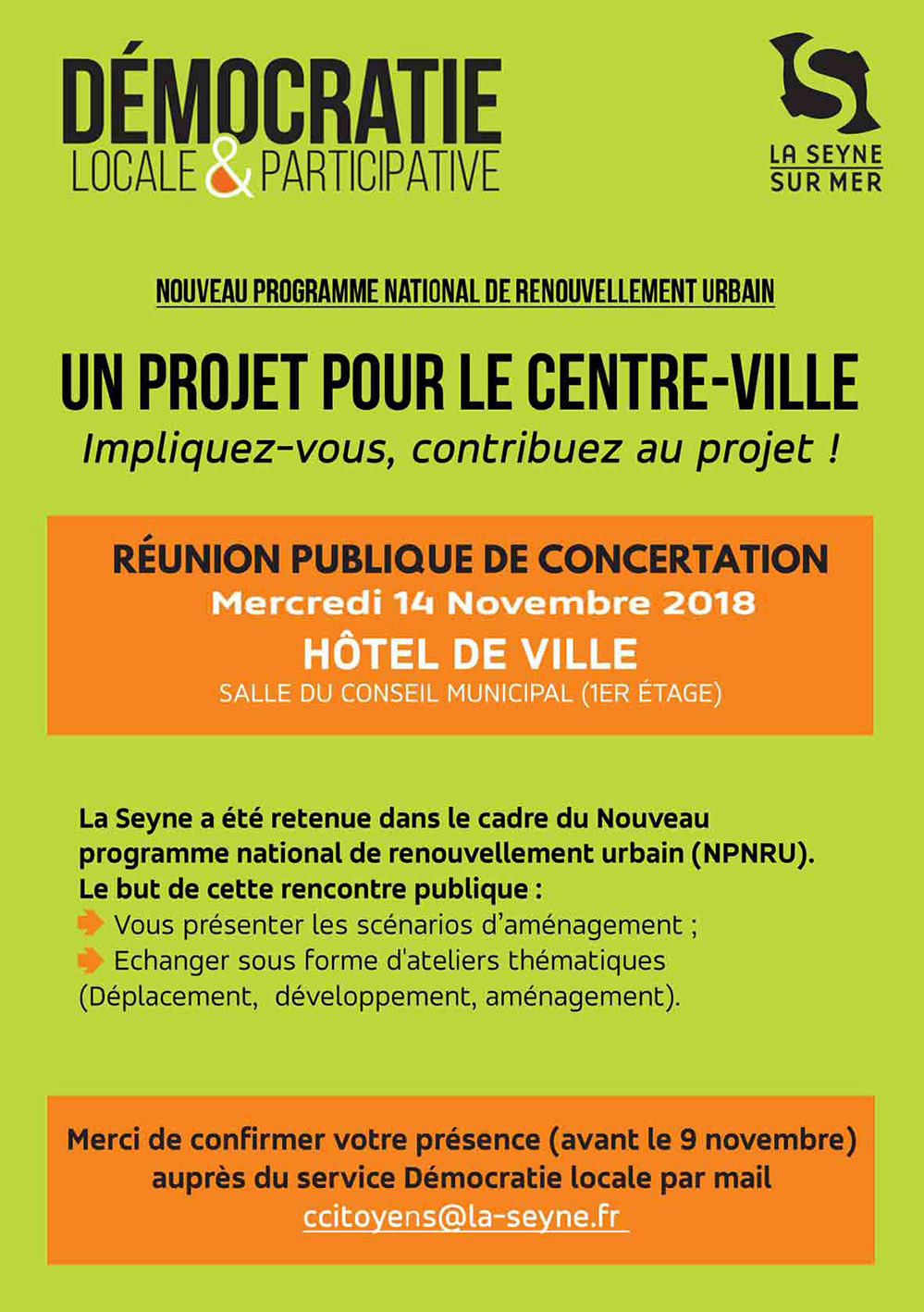 Rénovation Urbaine du Centre-Ville: Réunion publique du 14/11/2018 ... Inscrivez-vous avant le 09 - Vous avez jusqu'à ce vendredi 09 novembre 2018 pour indiquer votre présence à la réunion publique sur le Nouveau programme national de renouvellement urbain du centre-ville (NPNRU). Par mail : ccitoyens@la-seyne.fr ... Cette dernière aura lieu le 14 novembre 2018 à 14h30 en salle du Conseil municipal au 1er étage de l'Hôtel de Ville.