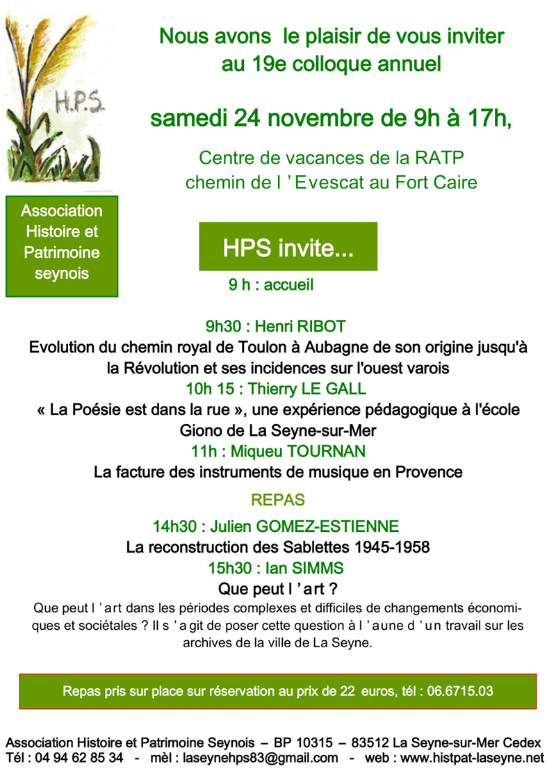 19e Colloque annuel HPS « Histoire et Patrimoine invite ... » le 24/11/2018 - L'association Histoire et patrimoine seynois organise, samedi 24 novembre à partir de 9 heures, avec le soutien de la Ville son 19e colloque sur le thème « Histoire et Patrimoine invite ... » au Centre de vacances RATP 75, chemin de l'Evescat au Fort Caire.