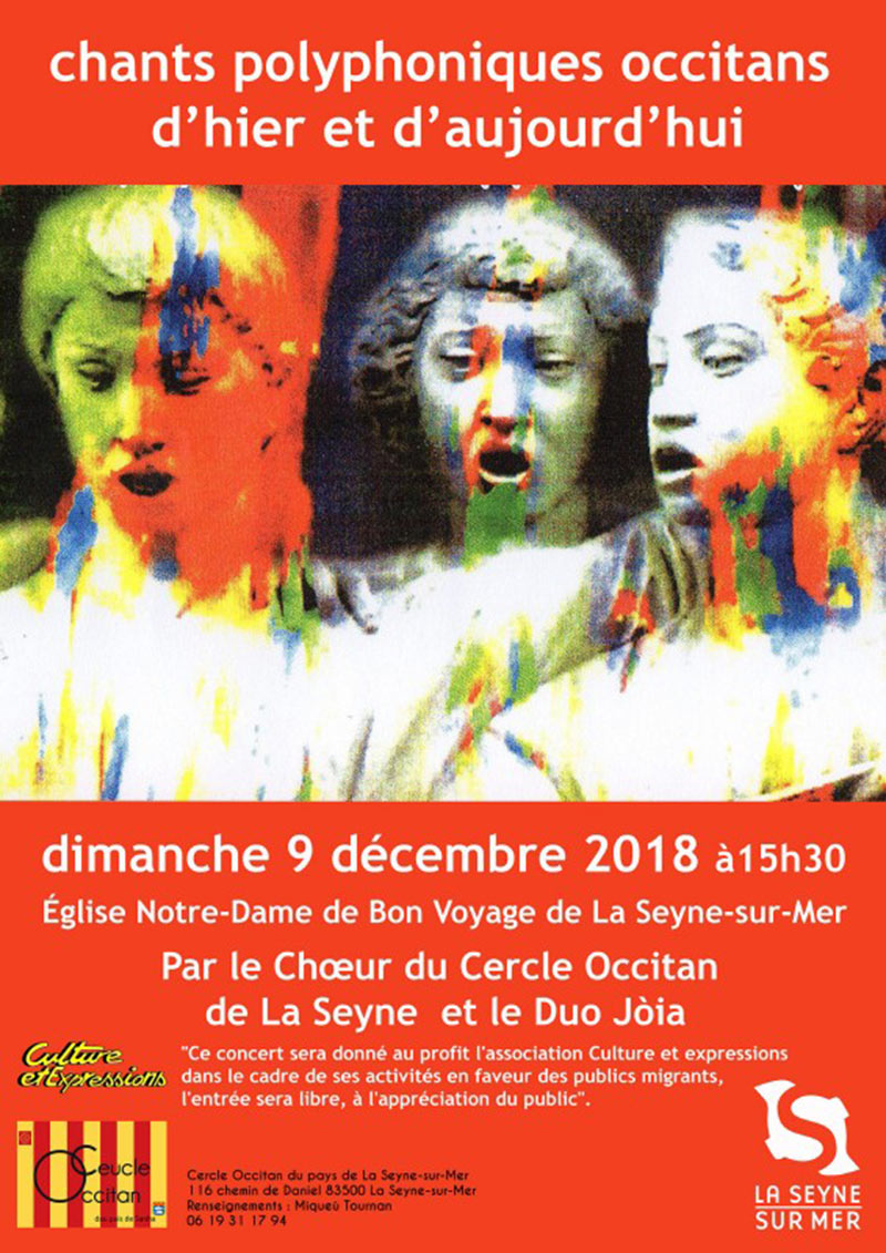 Chants polyphoniques occitans d'Hier et d'Aujourd'hui, le 09 Décembre 2018 - Un Concert proposé par le Chœur du Cercle Occitan de La Seyne et le Duo Joia. Il sera donné au profit de l'association Culture et expressions dans le cadre de ses activités en faveur des publics migrants, à 15h30.