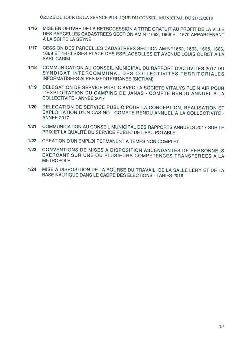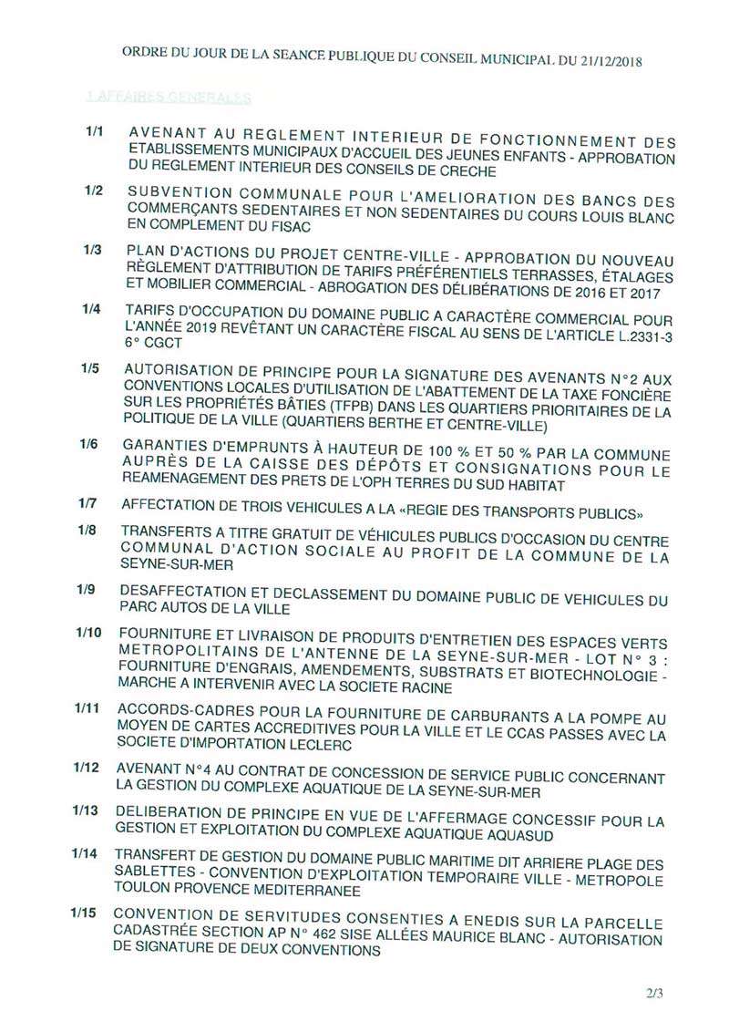 L'Ordre du Jour du Conseil municipal de La Seyne sur Mer du 21/12/2018