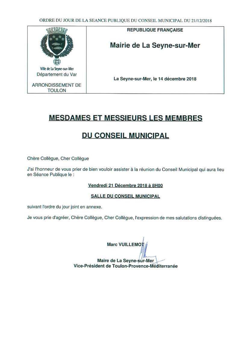 L'Ordre du Jour du Conseil municipal de La Seyne sur Mer du 21/12/2018 - Veuillez trouver ci-joint l'ordre du jour et l'invitation au prochain conseil municipal, vendredi 21 décembre 2018 à 8 heures en salle du conseil municipal de l'Hôtel de Ville.
