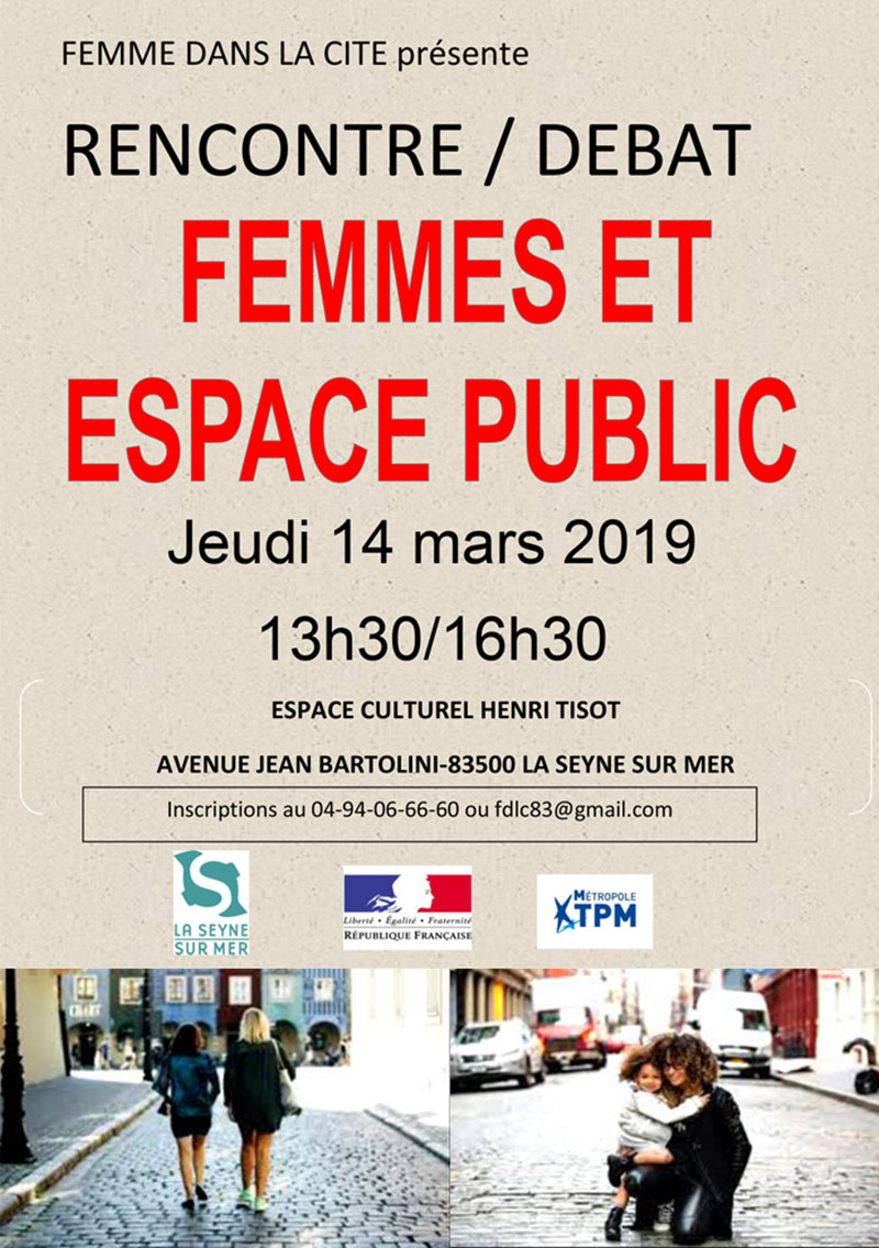 Dans le cadre de la semaine "seynoises" pour la lutte pour les droits des femmes, l'association organise une rencontre-échanges autour de "la place des femmes dans l'espace public, quels enjeux ?": le jeudi 14 mars 2019 de 13h30 à 16h30 à l'espace culturel TISOT.