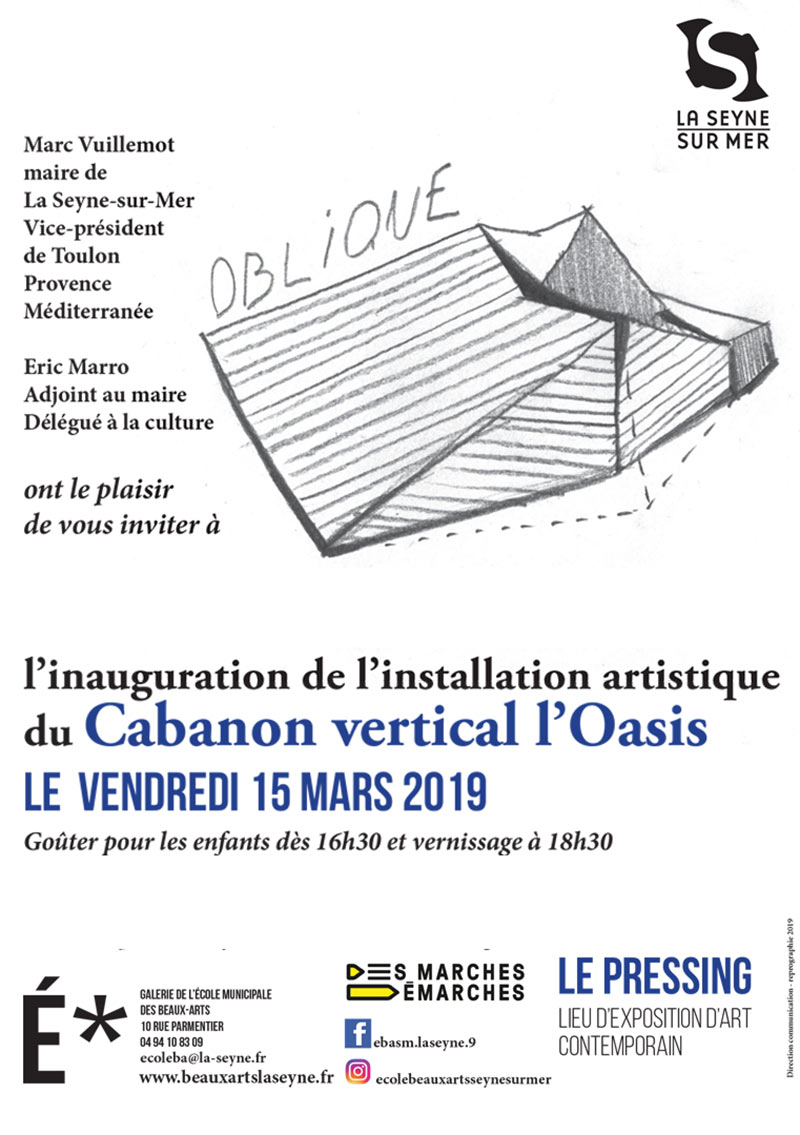 Installation urbaine: Inauguration de l'Installation artistique du Cabanon vertical l'Oasis, 15 Mars 2019 - Dans le cadre du dispositif « Des Marches – Démarches » du Frac PACA, et sous le financement de l’enveloppe « Arts Visuels » de la Ville, Le collectif « Le Cabanon Vertical » inaugure l'installation artistique intitulée "L'Oasis" vendredi 15 mars 2019.
