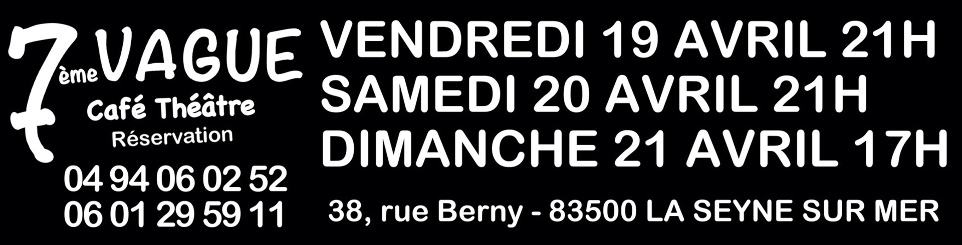 Vendredi 19, Samedi 20 et Dimanche 21 avril 2019: Ouverture des portes à 20h00 - Spectacle à 21h00 sauf dimanche à 17h00. 10 € adhérent / 15 € tout public. Réservation conseillée. Formule 5 € : tian de pâtes aux trois croûtons + boisson / mystère chantilly + café au Café Théâtre 7ème Vague, 38 rue Berny, 83500 La Seyne-sur-Mer. Réservation au 04.94.06.02.52. ou au 06.01.29.59.11.