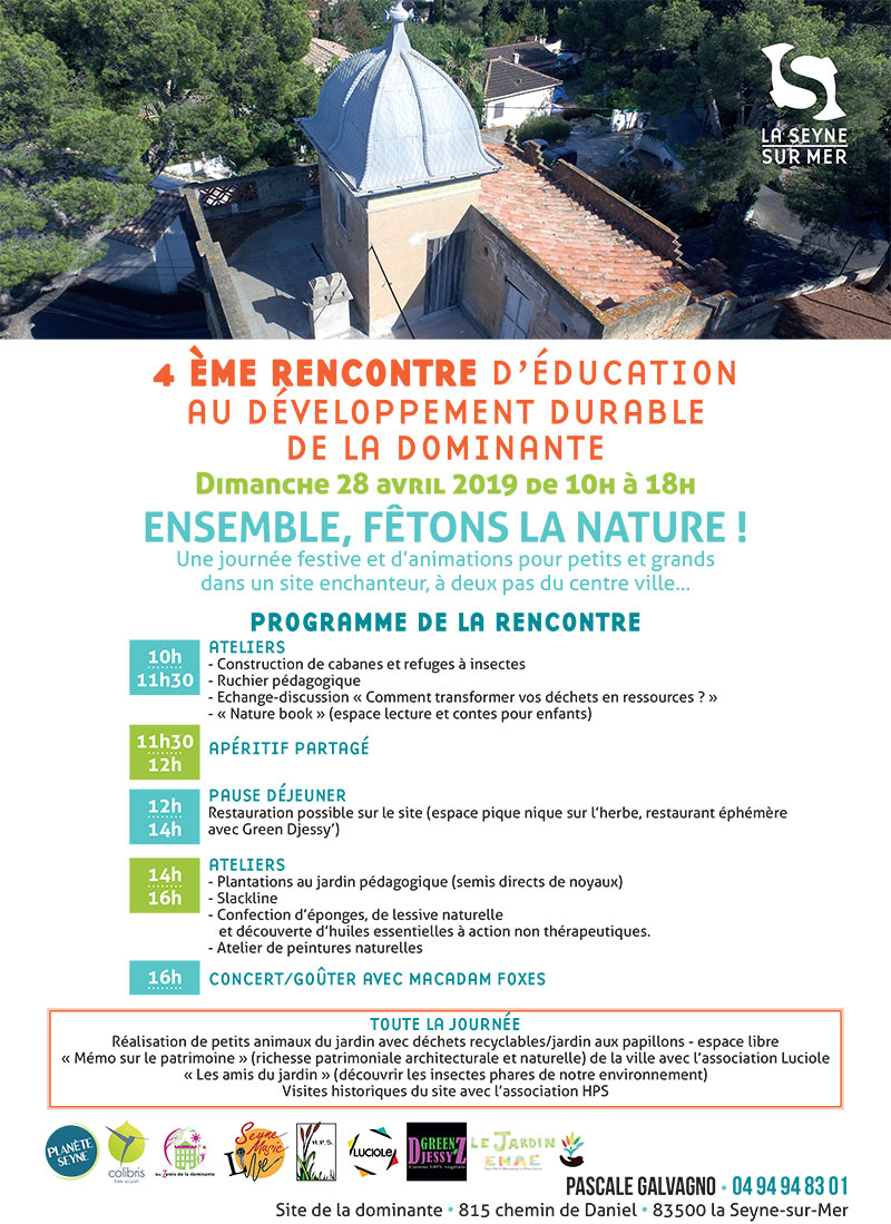 La 4ème Rencontre d’Education au Développement durable de la Dominante, le Dimanche 28 Avril 2019 - ENSEMBLE, FÊTONS LA NATURE !.. Une journée festive et d’animations pour petits et grands dans un site enchanteur, à deux pas du centre ville, le Dimanche 28 Avril 2019 de 10h00 à 18h00. Au Programme: ... en savoir plus - cliquez ici