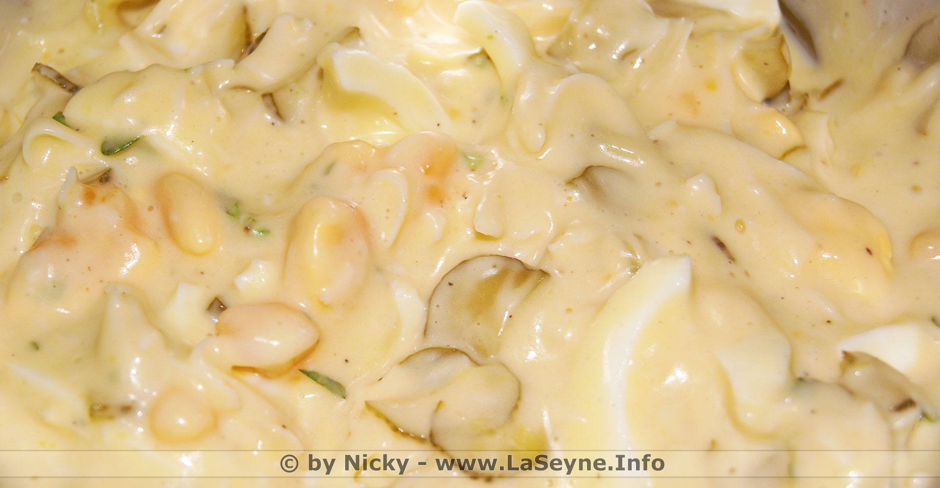 Ajouter à cette mayonnaise, des cornichons et oignons finement coupés, du gruyère râpe large, de la marjolaine fraîche du marché concassée et des œufs durs ... Rectifiez l'assaisonnement et ... Aaaa Taaable ... Bon appétit. Merci.