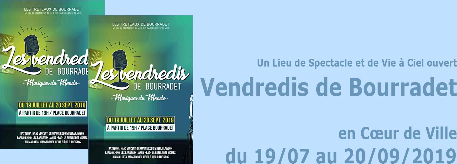 Les Vendredis de Bourradet 2019, du 18 Juillet au 20 Septembre - "Les Vendredis de Bourradet", saison culturelle consacrée aux musiques du monde. Cette série de concerts de plein air se déroule depuis 2013 dans le centre ancien, sur la place Bourradet aménagée en salle de spectacle de plein air. De nombreux artistes reconnus ou émergents sont ainsi accueillis durant la saison estivale, chaque vendredi soir, du 18 juillet au 20 septembre 2019 ... Contact: Direction culture et patrimoine de La Seyne - Tél: 04.94.06.96.60. - Lieu: Place Bourradet à 83500 La Seyne-sur-Mer ... au Programme: