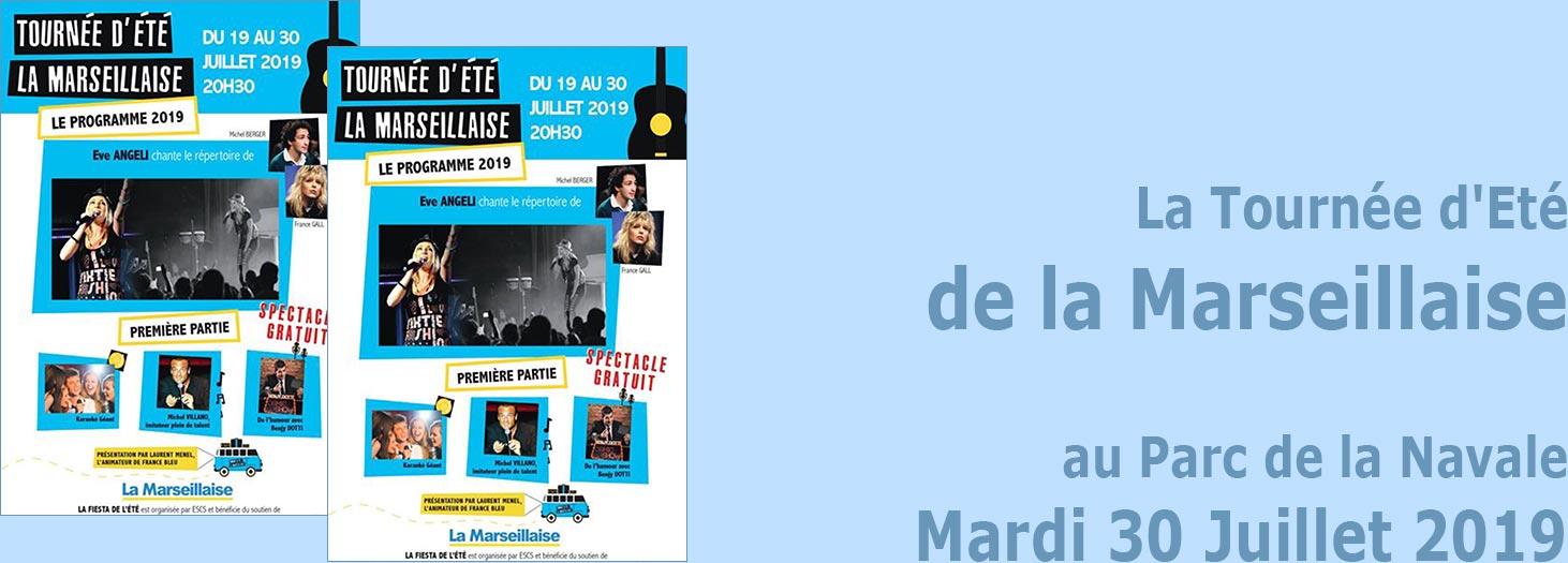 La Tournée d’Été de la Marseillaise, le 30 Juillet 2019 à La Seyne - Une Série de spectacles gratuits de variétés organisés par le journal la Marseillaise, présenté par Laurent Menel, l'animateur star de France Bleu, de 20h30 à 23h30 au parc de la Navale, cours Toussaint Merle, 83500 La Seyne-sur-Mer. Contact: Service événementiel de La Seyne au Tél : 04.94.06.90.42. ou Tél : 04.98.00.25.70. Au programme: