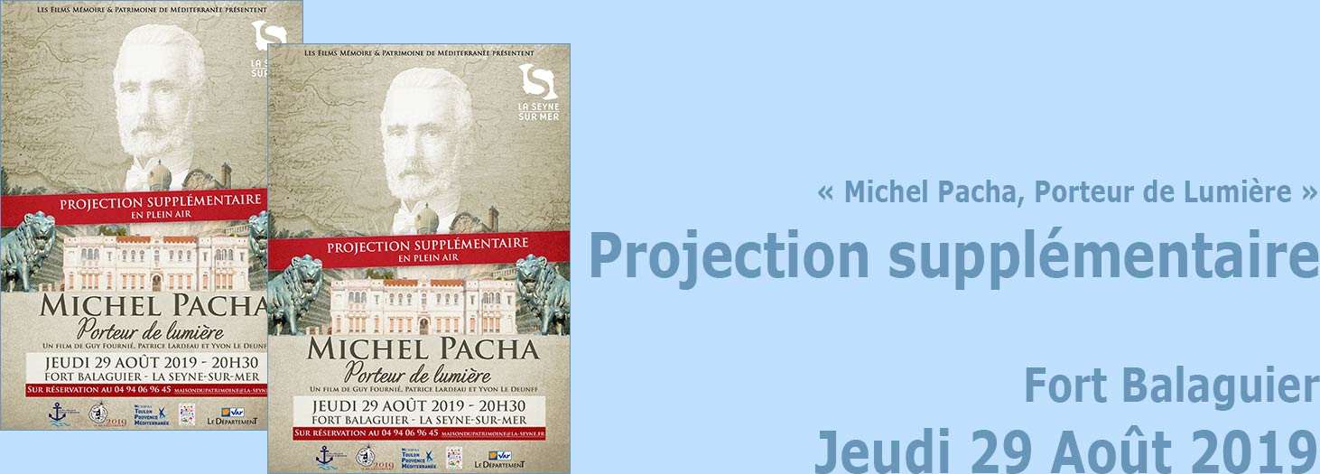 « Michel Pacha, Porteur de Lumière »: Projection supplémentaire du Documentaire, le 29 Août 2019 - A l'occasion du bicentenaire de la naissance de Marius Michel Pacha, une projection supplémentaire du documentaire de Guy Fournié, Patrice Lardeau et Yvon Le Deunff « Michel Pacha, porteur de lumière » est prévue en plein air, le jeudi 29 août 2019 à 20h30 au fort Balaguier. Les personnes intéressées sont priées de réserver par téléphone au 04.94.06.96.45. ou par mail sur maisondupatrimoine@la-seyne.fr.