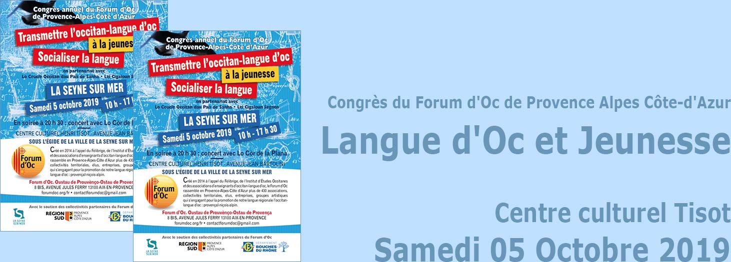 Congrès du Forum d'Oc de Provence Alpes Côte-d'Azur: « Transmettre l'Occitan Langue d'Oc à la Jeunesse, socialiser la Langue », le 05 Octobre 2019 - Vous êtes conviés au congrès du forum d’oc de Provence-Alpes-Côte d’Azur samedi 05 octobre 2019 de 10h00 à 17h30 au Centre culturel Tisot sur le thème « Transmettre l’Occitan-Langue d’Oc à la jeunesse, socialiser la langue ». Entrée libre et gratuite sur réservation avant le lundi 30 septembre 2019 de de 10h00 à 17h30 aux 04.88.19.53.96. ; 06.84.73.67.65 ; 06.81.67.26.81. ou par mail à contactforumdoc@gmail.com. Rendez-vous au Centre culturel Tisot, avenue Jean Bartolini.