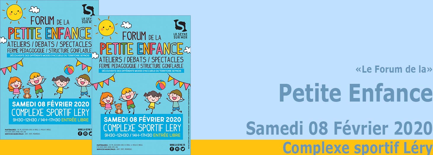 Le Forum de la Petite Enfance 2020, le 08 Février à Léry - Ateliers, débats, spectacles, ferme pédagogique et structure gonflable. Découverte des différents modes d'accueils du territoire seynois. Vous êtes conviés à la Journée festive gratuite autour de la petite enfance avec des ateliers-débats sur la pédagogie Montessori, des structures gonflables et des spectacles donnés par les assistantes maternelles, samedi 08 février 2020 de 09h30 à 12h30 et de 14h00 à 17h30, au Complexe sportif Léry, Boulevard de l'Europe. Rendez-Vous au Complexe sportif Léry, 26 CD de La Seyne à Ollioules, 83500 La Seyne-sur-Mer - Contact: Service Petite Enfance au 04.94.06.97.13. voir le Programme - cliquer ici