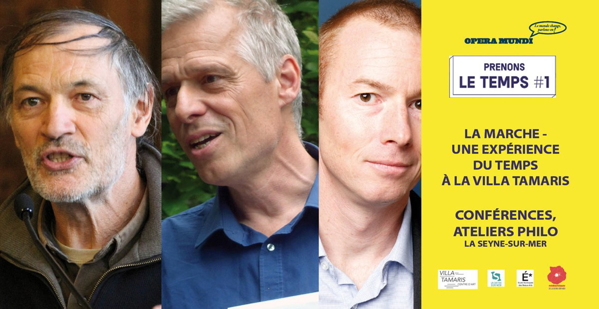 "La Marche, une Expérience du Temps", le 19/03/2020 à la Villa Tamaris - Avec Guillaume Rao, bio mécanicien, David Le Breton, socio-anthropologue et Hendrik Sturm, artiste marcheur. Comment l’homme en est-il venu à marcher ? Comment a-t-il appris et par quelles spécificités anatomiques pouvons-nous accomplir ces pas ? Qu’est-ce que la marche dit de notre rapport au temps, au monde, à soi, aux autres ? Prenons un temps pour ces questions avec le bio mécanicien Guillaume Rao et le l’anthropologue David Le Breton. En leur compagnie et emmené par l’artiste Hendrik Sturm, faisons l’expérience sensible du temps au long d'un parcours marché dialogué aux confins de la Seyne sur Mer ! Jeudi 19 mars 2020 de 17h00 à 19h00 à la Villa Tamaris, centre d'art, au 295 av. de la Grande Maison, 83500 La Seyne-sur-Mer. Contact: Association Opera Mundi au 07.82.41.11.84. et sur www.opera-mundi.org. Entrée libre sur réservation.