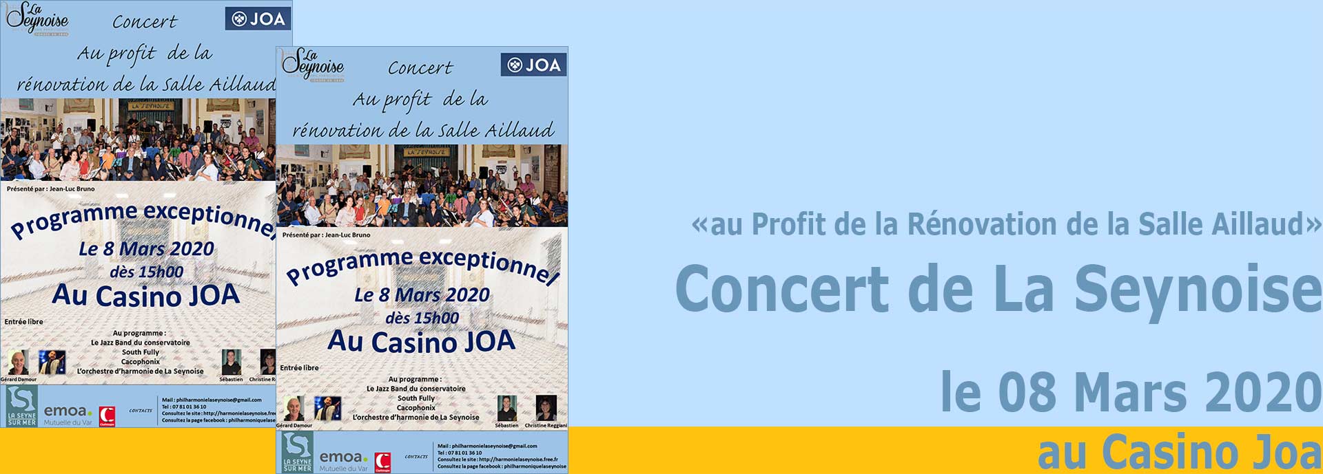 Concert de la Philharmonique "La Seynoise" au Profit de la Rénovation de la Salle Aillaud, le 08/03/2020 - Un Concert exeptionnel au profit de la rénovation de la salle Aillaud avec les ensembles invités : Jazz Band du conservatoire de La Seyne sur Mer, direction Christine Reggiani ; South Fully (groupe de rock créé par les jeunes musiciens de la Philharmonique La Seynoise); Cacophonix (orchestre de bal rétro de La Seynoise) avec le chanteur Jean-Luc Bruno. Dimanche 08 mars 2020 à 15h00 au Casino Joa, 340 Cours Toussaint Merle à La Seyne-sur-Mer. Contact: Philharmonique La Seynoise au 07.81.01.36.10. Entrée libre.