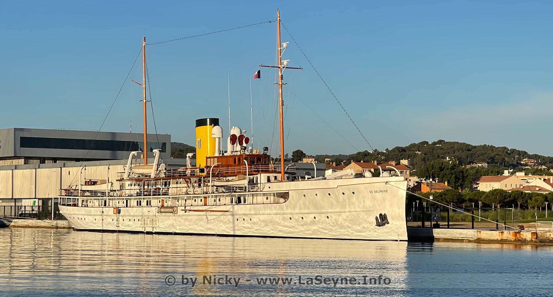 Le Yacht "SS Delphine" amarré à La Seyne - Le SS Delphine est un yacht à vapeur construit en 1921 pour Horace Dodge, cofondateur du constructeur automobile américain Dodge et est l'un des derniers yachts à vapeur encore en service. Le yacht est lancé le 02 avril 1921, portant le prénom de la fille d'Horace Dodge. D'une longueur de 75 mètres, il est équipé de trois chaudières Babcock and Wilcox qui alimentent deux moteurs à quadruple expansion de 1500 chevaux. « De tous les grands yachts à vapeur américains construits entre 1893 et 1930, le Delphine est le seul encore en activité à être resté dans sa configuration originale dont ses machines à vapeur d'origine. » ...
