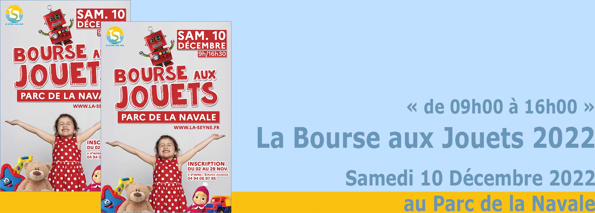 La Bourse aux Jouets 2022, le 10 Décembre au Parc de la Navale - La bourse aux jouets à La Seyne se tiendra le samedi 10 décembre 2022 sur le parc de la Navale de 09h00 à 16h30. Cette manifestation permettra aux enfants de vendre jeux et jouets qu’ils n’utilisent plus. La recette sera reversée au profit de l'UNICEF. Le service jeunesse tiendra pour sa part un stand où chacun pourra faire un don de jouets, au profit de l'associations les Restos du cœur. Renseignements au 04.94.06.97.95.