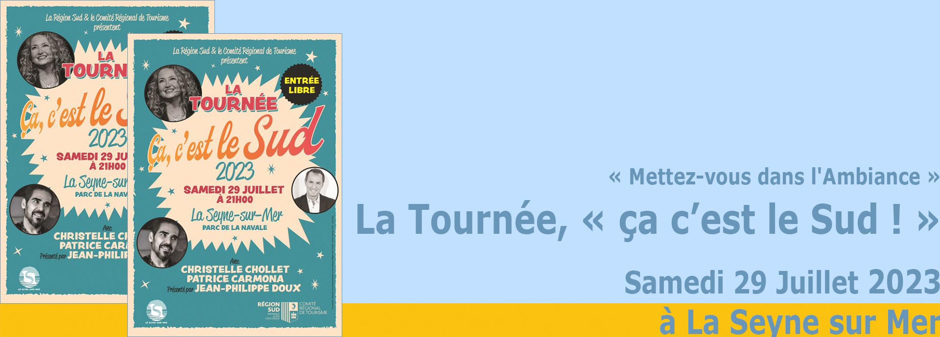 La Tournée, « ça c’est le Sud ! », le 29/07/2023 à La Seyne sur Mer - La Tournée, « ça c’est le Sud ! » est une tournée de spectacles qui visite 15 villes et villages de la région Provence-Alpes-Côte d'Azur. Avec le soutien des maires, la tournée proposera un spectacle gratuit, pour tous, à 21 heures, présenté par Jean-Philippe Doux. Deux artistes se produiront chaque soir: le chanteur à voix Patrice Carmona et l'humoriste-chanteuse-imitatrice Christelle Chollet. ... en savoir plus - cliquez ici