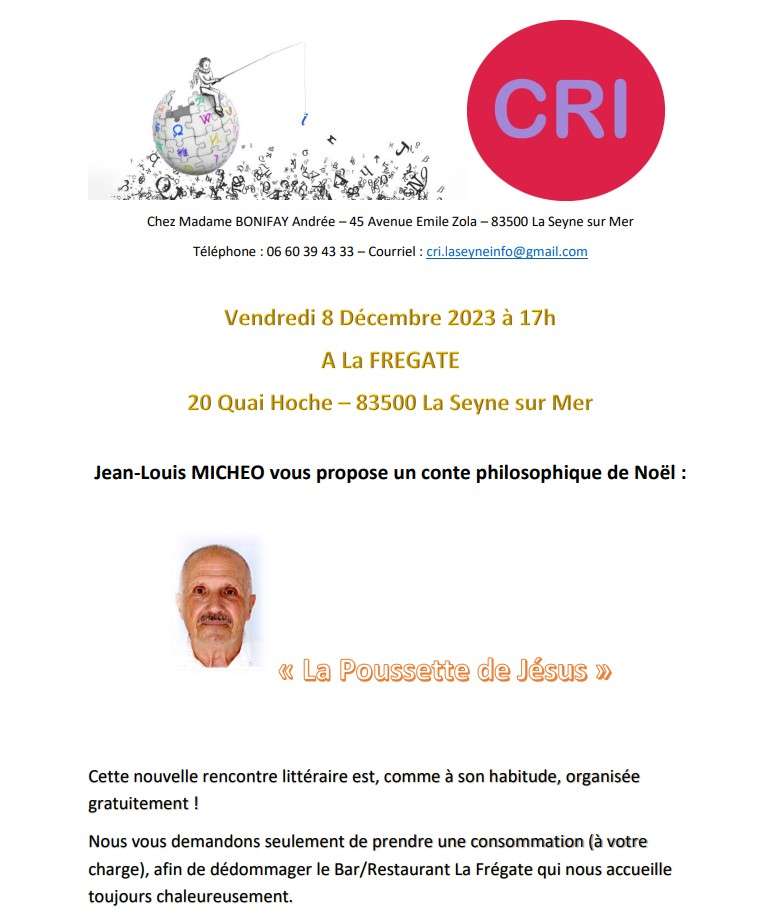 notre ami Jean-Louis Michéo sera parmi nous à la Frégate vendredi 8 décembre 2023 à 17h, pour nous lire son "conte de Noël" philosophique.