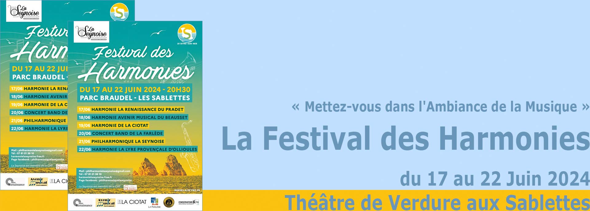 Le Festival des Harmonies 2024, du 17 au 22 Juin à La Seyne - La Philharmonique la Seynoise a le plaisir d'annoncer le lancement de la 7è édition du Festival des Harmonies de la Seyne. Cet événement musical incontournable débutera le 17 juin avec l'orchestre d'Harmonie Renaissance du Pradet et se clôturera le samedi 22 juin avec la prestation de ... en savoir plus - cliquez ici