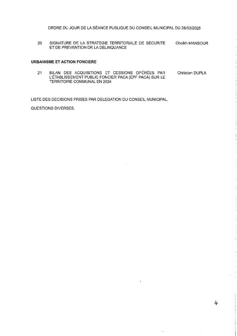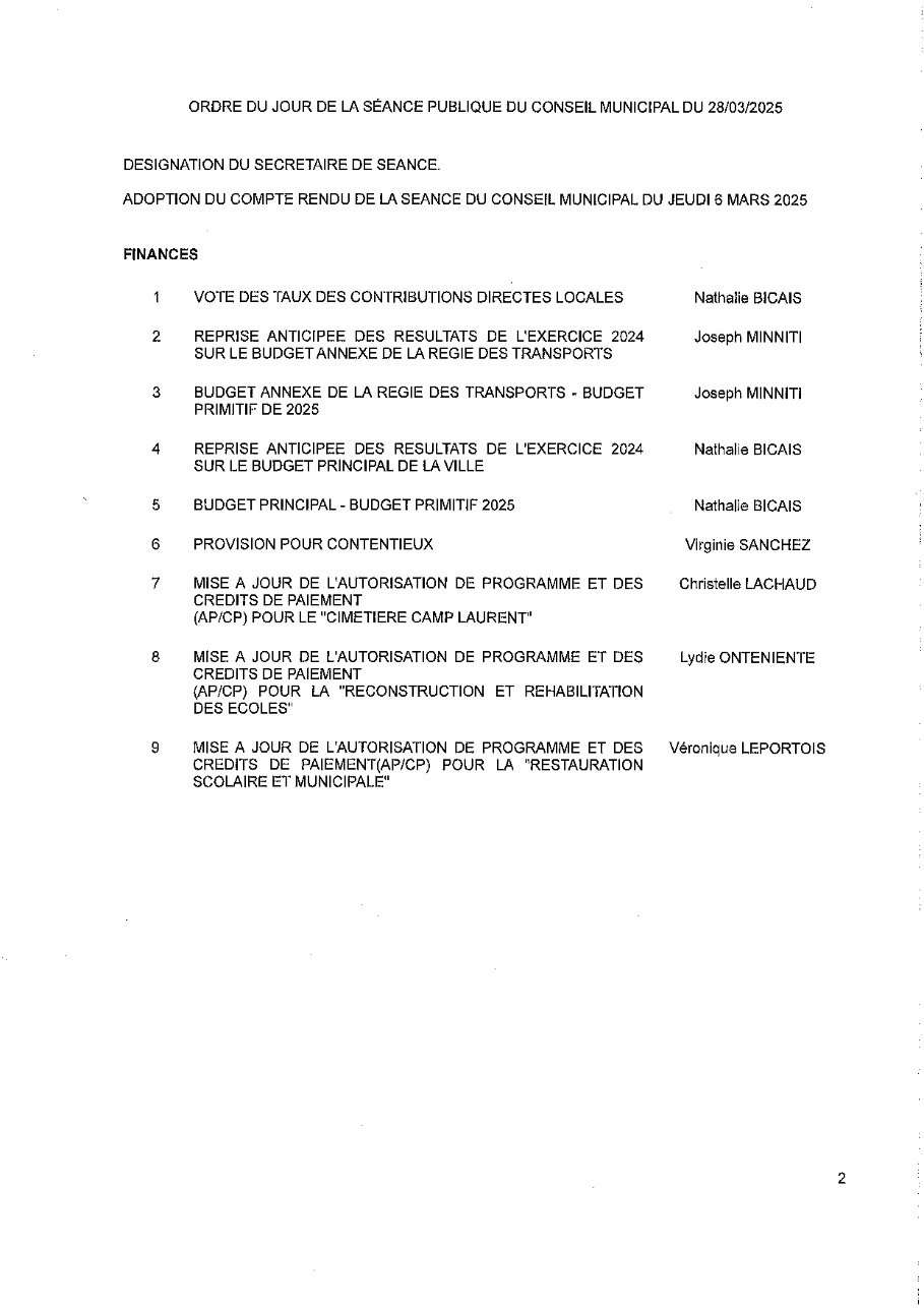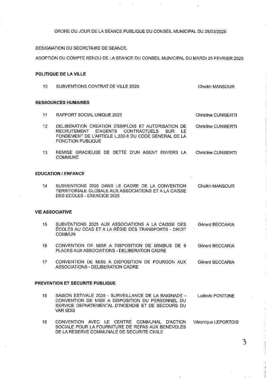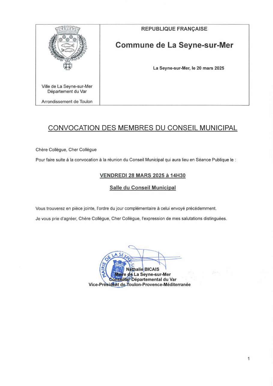 L'Ordre du Jour du Conseil municipal Seynois du Vendredi 28/03/2025 à 14h30