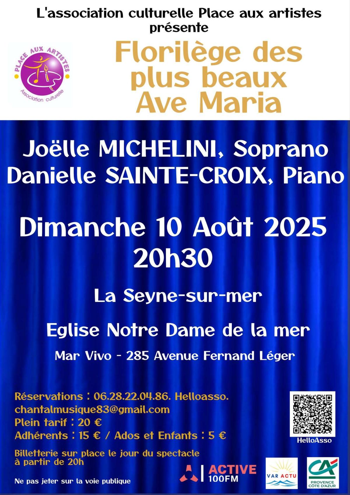 La soprano à la carrière internationale Joëlle MICHELINI, accompagnée au piano par Danielle SAINTE-CROIX, vous propose un florilège de prières musicales empreintes d’émotion et de spiritualité, dans le cadre intime et inspirant de l’Église Notre-Dame de la Mer – Mar Vivo – 285, Avenue Fernand Léger – 83500 LA SEYNE-SUR-MER, le dimanche 10 août à 20h30.