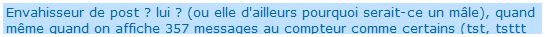 Envahisseur de post ? lui ? (ou elle d'ailleurs pourquoi serait-ce un mâle), quand même quand on affiche 357 messages au compteur comme certains (tst, tsttt tsttt...) on fait preuve d'un peu plus de mesure dans ses affirmations. Armagueddon, c'est un peu comme les règles : c'est quand on les a plus qu'on les regrette (et vous pouvez donner à règles le sens qui vous agrée). Moi personnellement je trouve que ses interventions ne manquent pas de piquant;