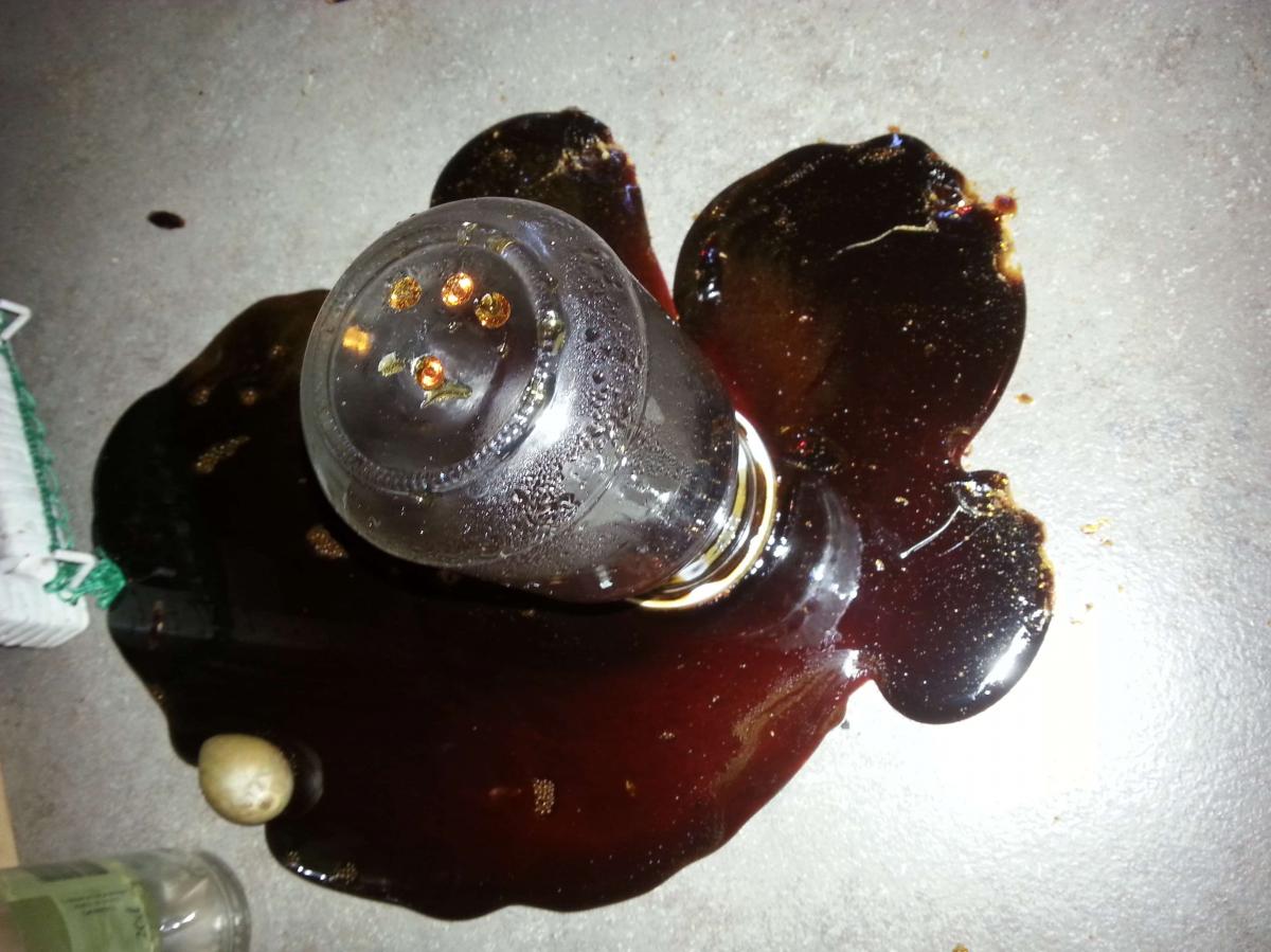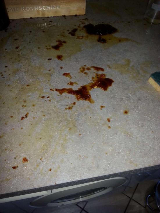 Vers 17h, donc, me voilà revenue des bras de Morphée, prête à aller me faire une petite verveine (en tisane cette fois, pas en sirop). Et que vois-je ? Horreur ! (oui, deux fois dans le texte, ça peut le faire. C'est pour le prof de français dans mes amis qui me corrige...) : Le couvercle de mon pot n'était apparemment pas étanche, et tout le caramel s'est répandu (un peu comme dans la chanson de Brel...Heu, ça c'est une digression, vous le sauriez si vous veniez à notre atelier d'écriture) tout autour de mon bocal, sur le plan de travail.