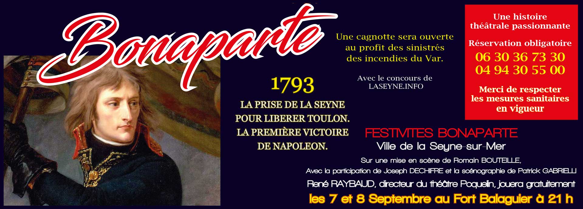 BUONAPARTE 1793 - Mardi 07 et Mercredi 08 septembre 2021, à 21 heures, le Fort de Balaguier accueillera les deux spectacles donnés par le Théâtre Poquelin et René Raybaud sur le thème de la bataille décisive qui a eu lieu le 26 Nivôse 1793, sur les terres seynoises. Racontée avec talent et enthousiasme, l'épisode de la prise de l'Eguillette et du fort Mulgrave met en exergue les soldats de l'an 2 et la première victoire du futur empereur Napoléon Buonaparte.