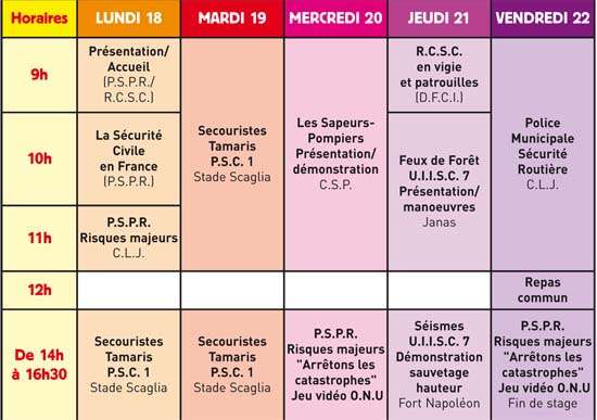 Il y aura une présentation de la sécurité civile et des risques majeurs, une sensibilisation à la sécurité routière, des cours de secourisme, des démonstrations avec les sapeurs-pompiers, une présentation des vigies, des patrouilles à Notre-Dame-du-Mai, et des manoeuvres à Janas, ainsi que des démonstrations de sauvetage en hauteur au fort Napoléon. On mettra également les jeunes devant des simulateurs avec un jeu vidéo type SimCity : ils auront en charge un secteur à développer en fonction d'un risque connu ; ils devront donc mettre en oeuvre des actions de prévention avant le déclenchement de la « catastrophe ». Au final, cette semaine vise donc à susciter des vocations et à permettre aux jeunes stagiaires d'intégrer la Réserve communale.