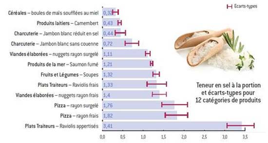 L'enquête d’observation menée sur 341 références dans les rayons de six grandes enseignes de distribution et deux de hard-discount nous a permis de comparer les teneurs en sel ramenées à la portion pour 12 catégories de produits alimentaires (voir graphique ci-dessus).