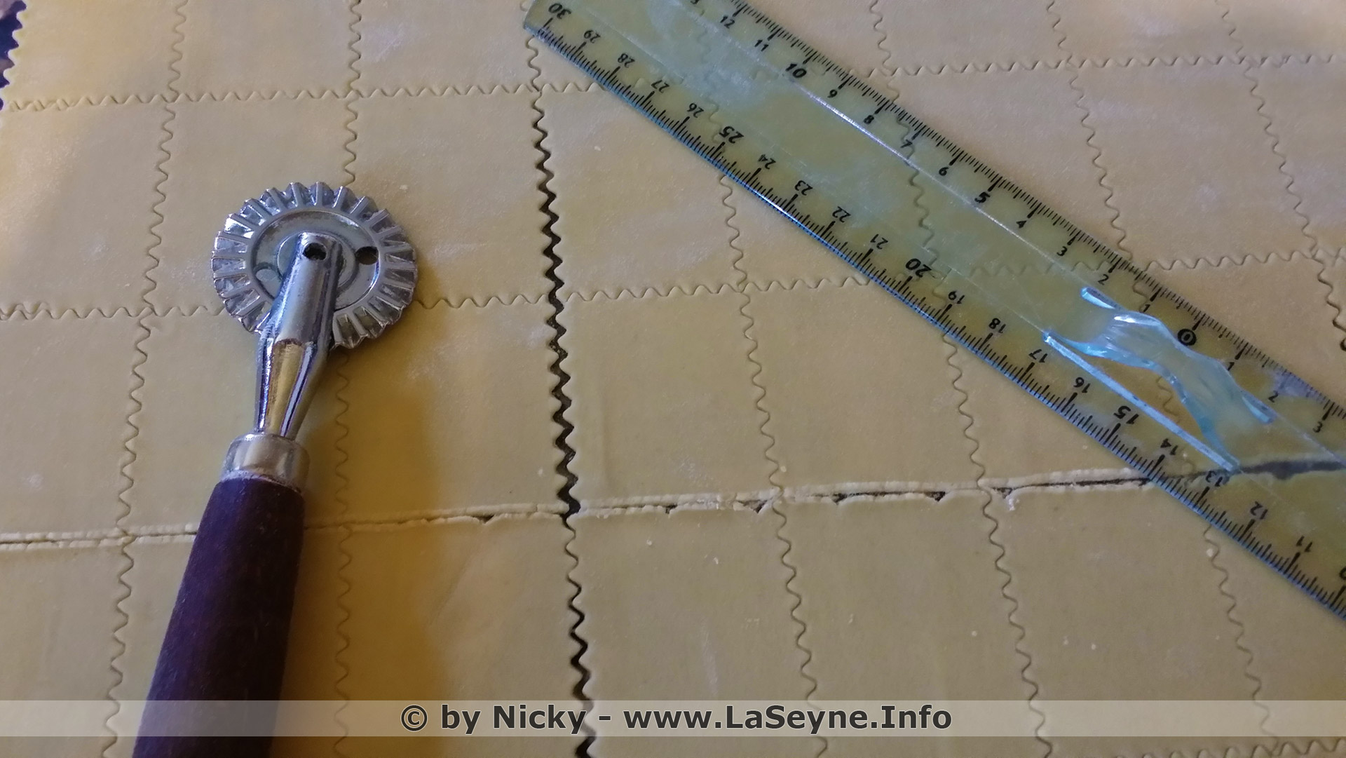 Faire passer la pâte une 10ène de fois par les rouleaux de la machine à pâtes, position 1, en la repliant sur elle même avant chaque passage ... abaisser jusqu'à la dernière position ... puis suivre les images ci-dessous ...