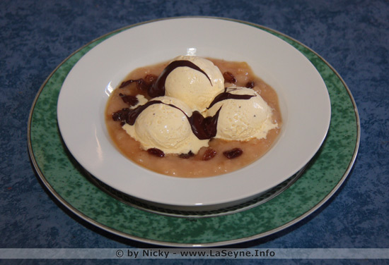 Allez, une petite Glace à la Vanille sur son Lit de Compote de Nectarines et Raisins secs au Rhum et Chocolat