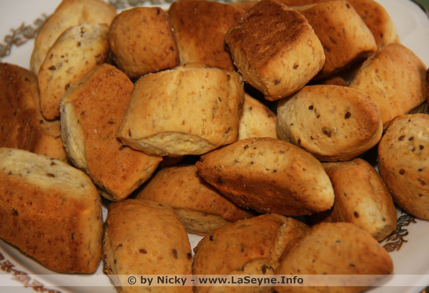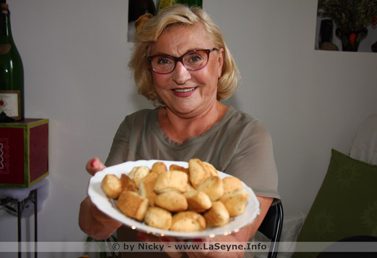 Mélanger la farine, le sucre, l'anis et la levure chimique ... ajouter l'huile, le vin et la pincée de sel ... pétrir et façonner la pâte en forme de boudin ... couper en biais les pâtons ... préchauffer le four à 180°-200°C ... enfourner et laisser cuire une vingtaine de minutes ...