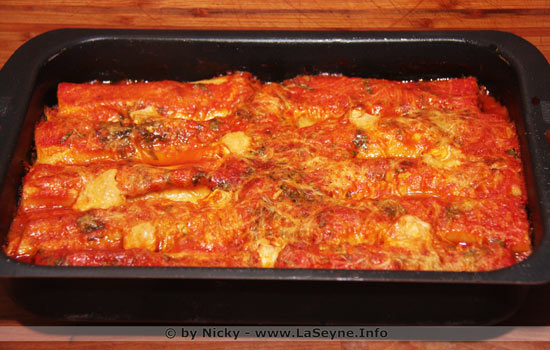 ... poser les deux bandes de pâte sur le plan de travail et garnir celles-ci tout le long avec la farce à l'aide d'une poche à douille ... les enrouler sur elles-même puis les détailler à la longueur voulu ... placer les cannelloni dans un plat graissé ... recouvrir de la sauce tomate et parsemer de parmesan fraichement râpé ... enfourner à 180°C pendant environ 45min ...