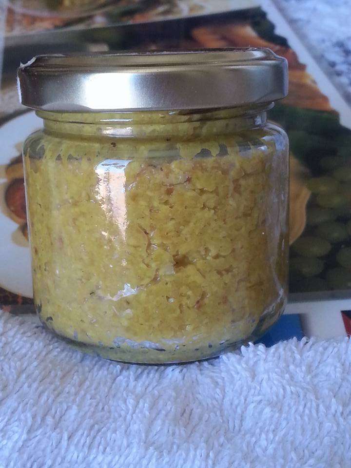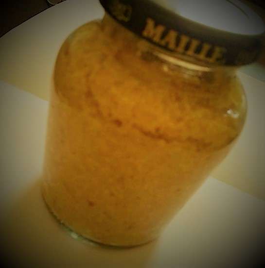 La Moutarde faite Maison du Gobie Bleu - Moudre au moulin à café, finement, petit à petit pour ne pas faire chauffer, • 100g de Graines de Moutarde jaune avec • 1 cc de Coriandre et passer le tout au chinois (tamis), dans un cul de poule (saladier) ... Ajouter • 1/2 cc de Curcuma • 1 cc de Sel • du poivre noir et blanc du moulin, et mélanger le tout à l'aide d'un fouet ... Poursuivre avec • 100g de Vinaigre de cidre, • 100g d'Eau, • 1 cc de miel et un filet d'huile d'olive. Bien mélanger le tout à l'aide d'un fouet.