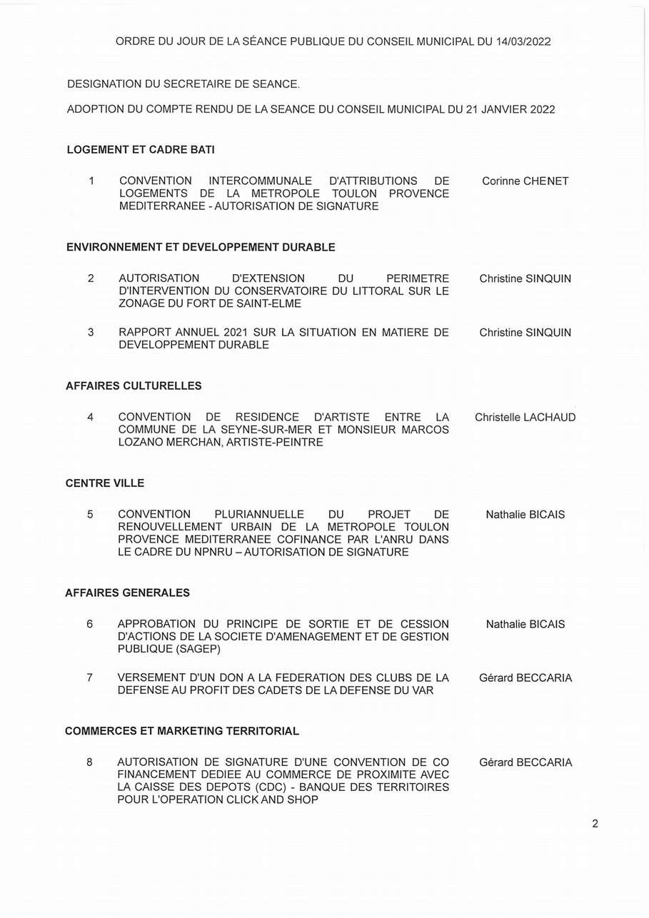 L'Ordre du Jour du Conseil municipal Seynois du Lundi 14/03/2022