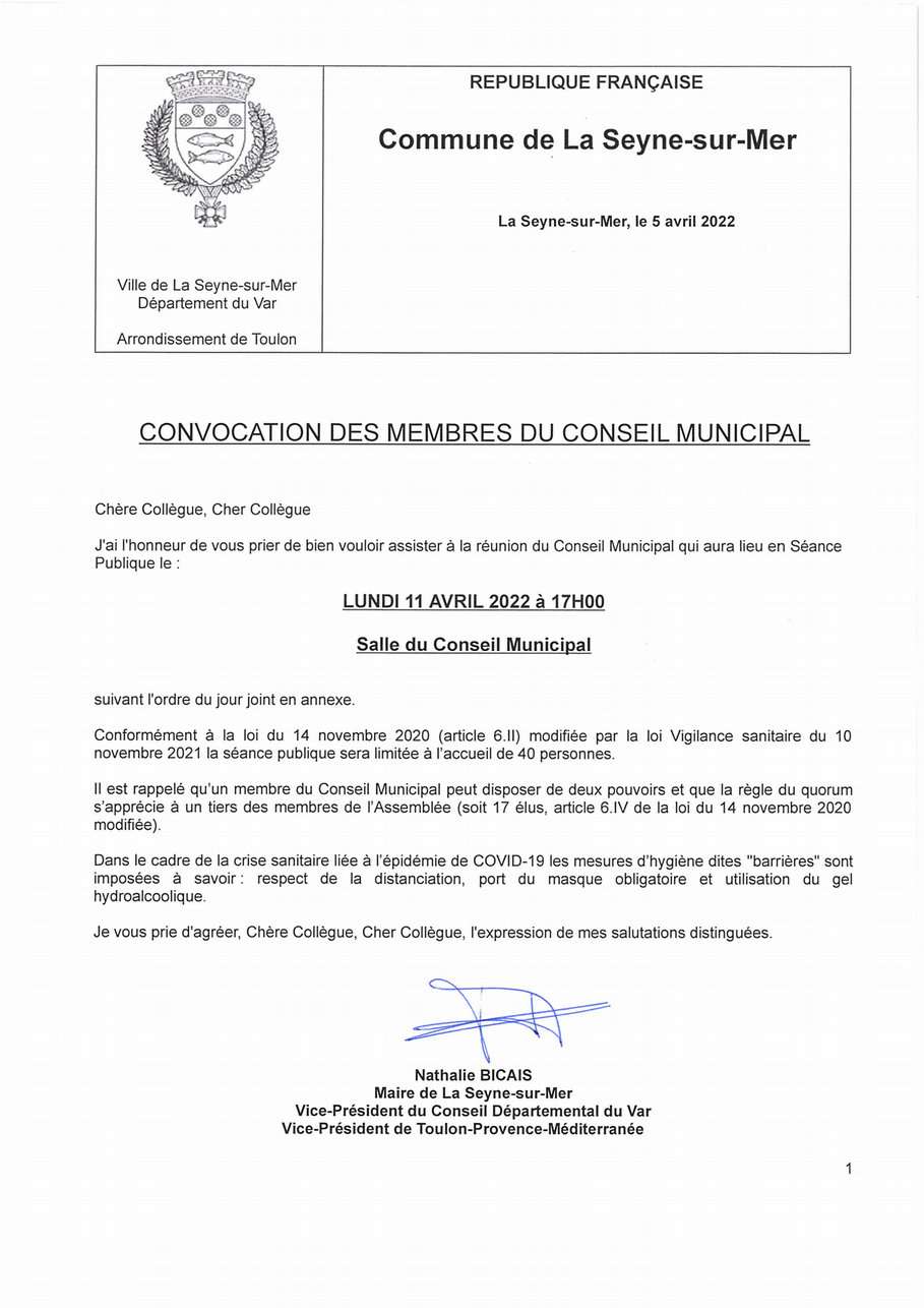 L'Ordre du Jour du Conseil municipal Seynois du Lundi 11/04/2022 - Le prochain conseil municipal se réunira lundi 11 avril 2022 à 17 heures. Rendez-vous est fixé en salle du conseil au premier étage de l'hôtel de ville. A noter que dans le cadre de la crise sanitaire liée à l'épidémie de COVID-19, les mesures d'hygiène dites « barrières » sont imposées (port du masque, gel). Conformément à la loi du 14 novembre 2020 prorogeant l'etat d'urgence, la séance publique sera limitée à 40 personnes. Vous trouverez ci-joint l'ordre du jour.