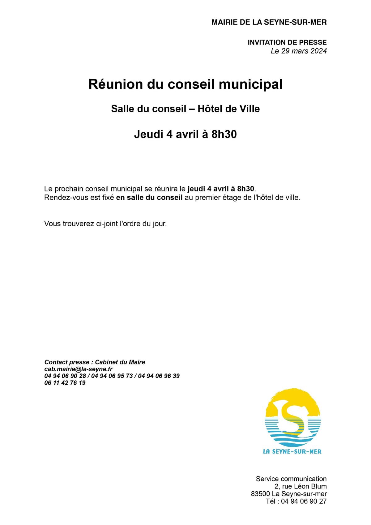 L'Ordre du Jour du Conseil municipal Seynois du Jeudi 04/04/2024 - Le prochain conseil municipal se réunira le jeudi 04 avril 2024 à 08h30. Rendez-vous est fixé en salle du conseil au premier étage de l'hôtel de ville. Vous trouverez ci-joint l'ordre du jour.