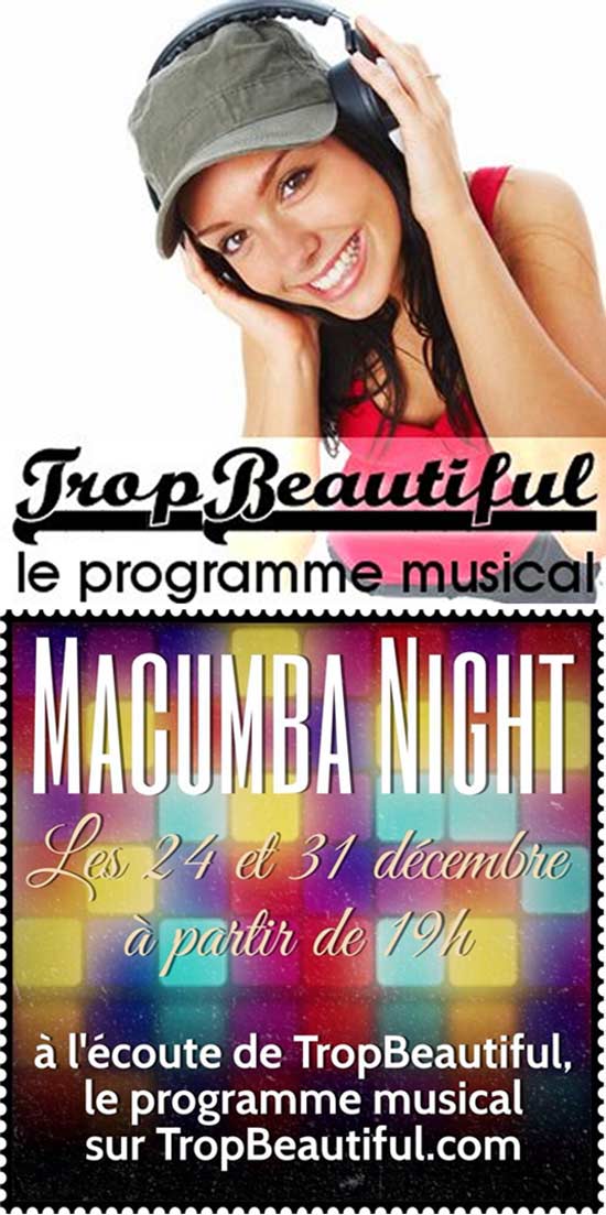 La Macumba Night c’est une sélection des tubes cultes diffusés dans les discothèques des années 80 à aujourd’hui, toujours en non stop et sans animateur. Créée le 21 juin 2008 à La Garde (Var), la radio en ligne TropBeautiful diffuse un programme musical ininterrompu avec un discret habillage d’antenne pour seules ponctuations. Offrant la possibilité d’écouter les tubes d’un jour et de toujours, des artistes d’aujourd’hui et de demain, TropBeautiful est le programme musical familial par excellence. On peut l’écouter aussi bien chez soi, au bureau, que dans un espace public (galerie marchande ou commerce) étant donné la nature de sa programmation éclectique et généraliste à la fois. Outre les titres incontournables de la chanson française et pop/rock du moment, TropBeautiful s’est fait une spécialité de diffuser les tubes de ces 20 à 30 dernières années oubliés des radios mais présents dans toutes les mémoires. En version originale ou inédite au travers par exemple de reprises confidentielles bien qu’enregistrées par les plus grands artistes, TropBeautiful collecte les pépites des années 80 à aujourd’hui dans un programme sans animateur et écouté, pour plus d’un auditeur sur deux, hors de France.
