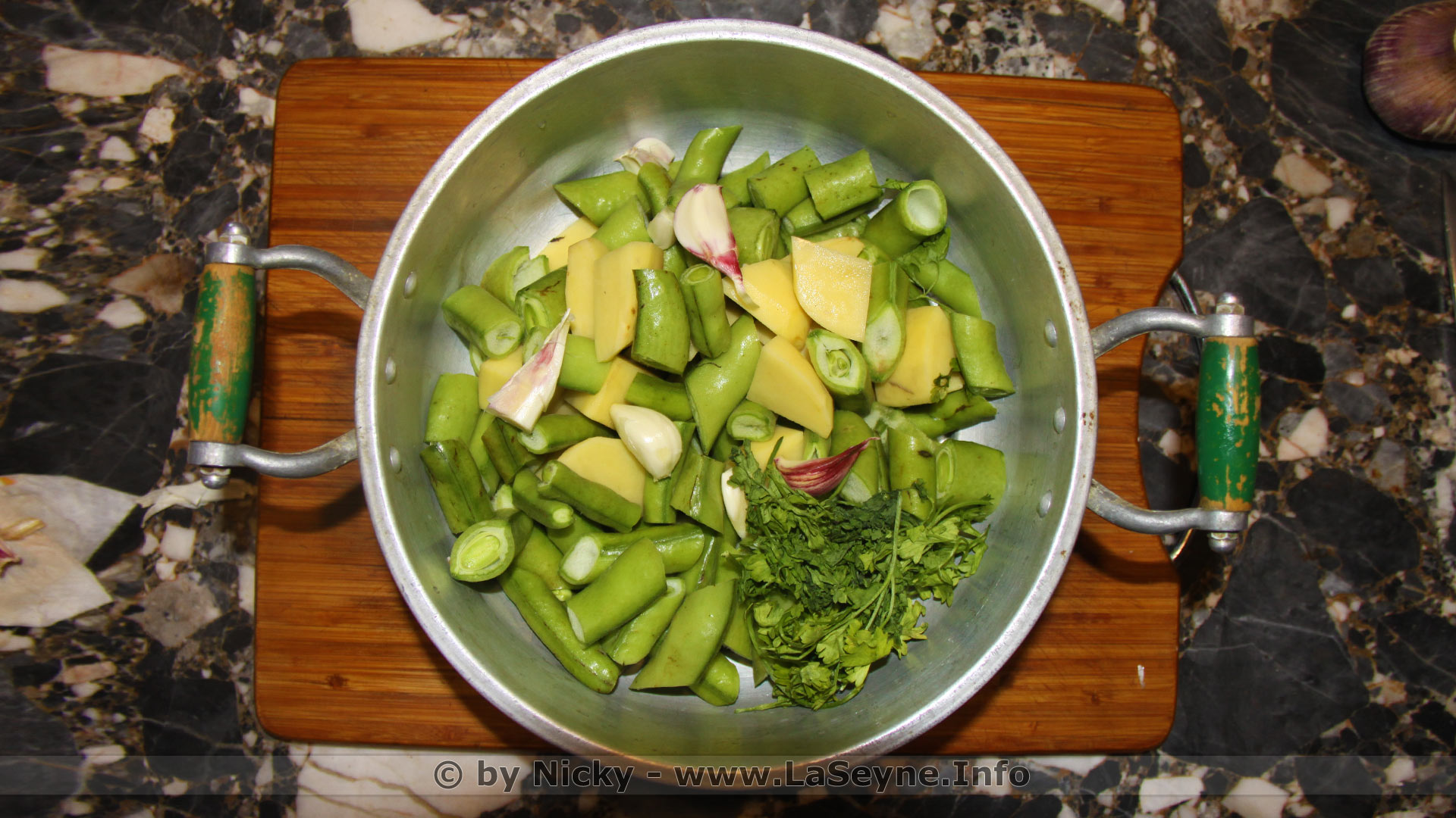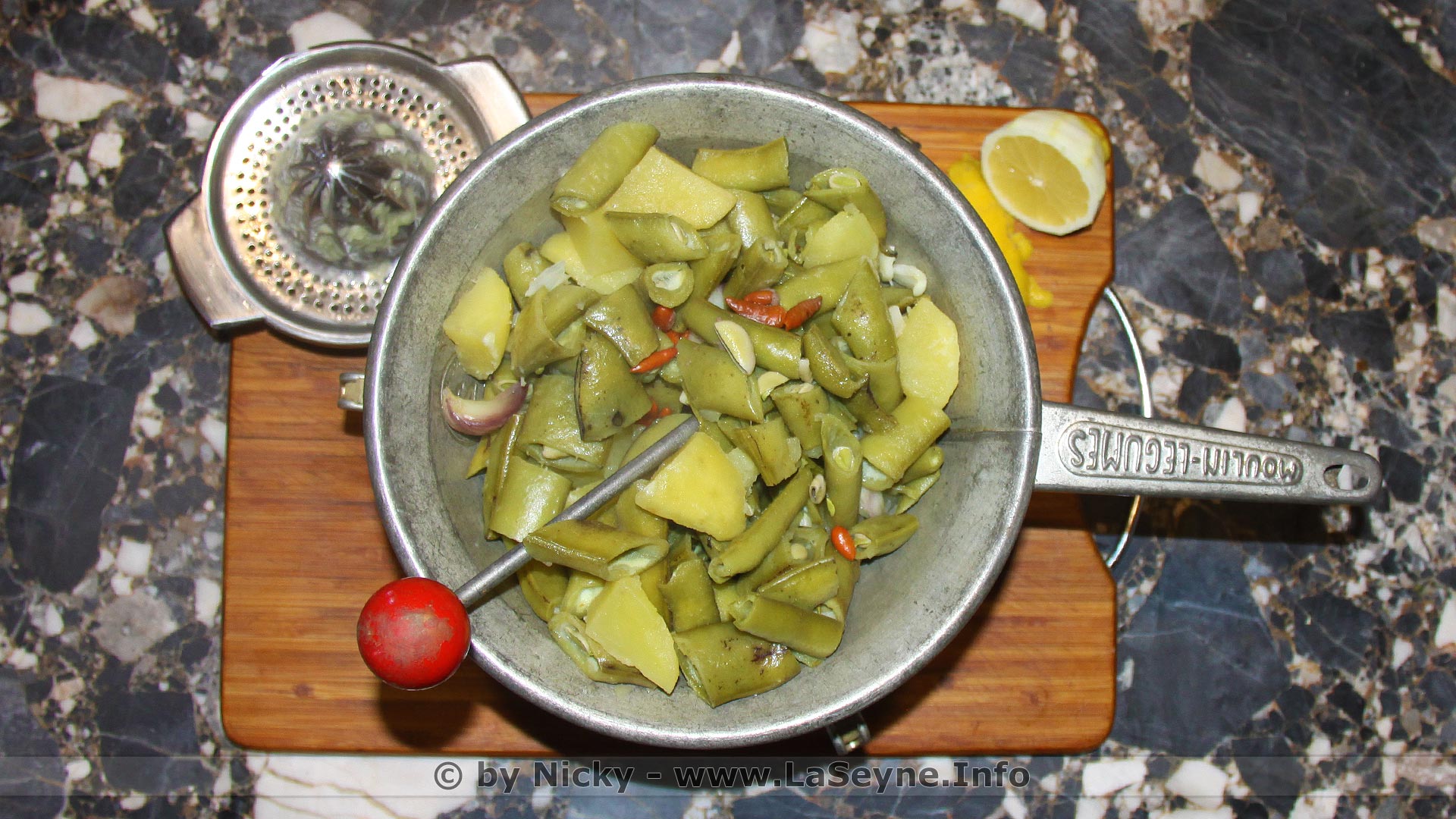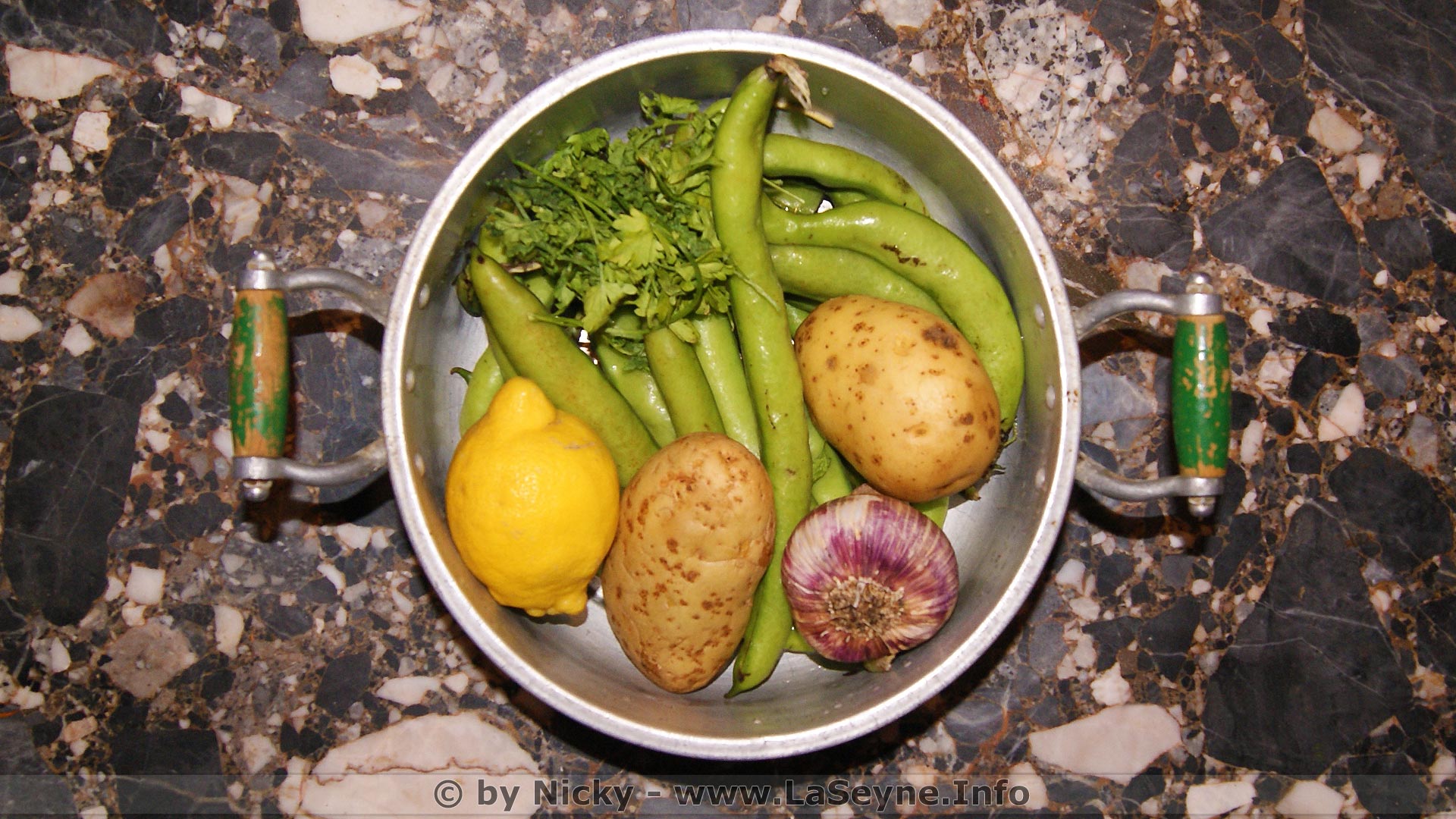 Fruits et Légumes du Mois: Un Caviar de Fèves - Ingrédients: Des fèves du marché, de l'ail frais, des pommes de terre du marché, du persil frais du marché, un demi citron non traité de chez l'arbre de la voisine, de l'huile d'olive, du sel et du poivre du moulin et quelques "piments bec d'oiseau" pour l'eau de cuisson.