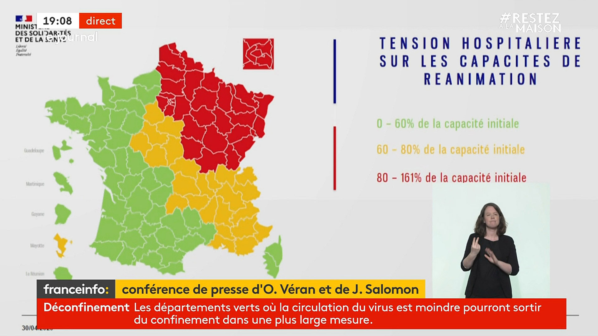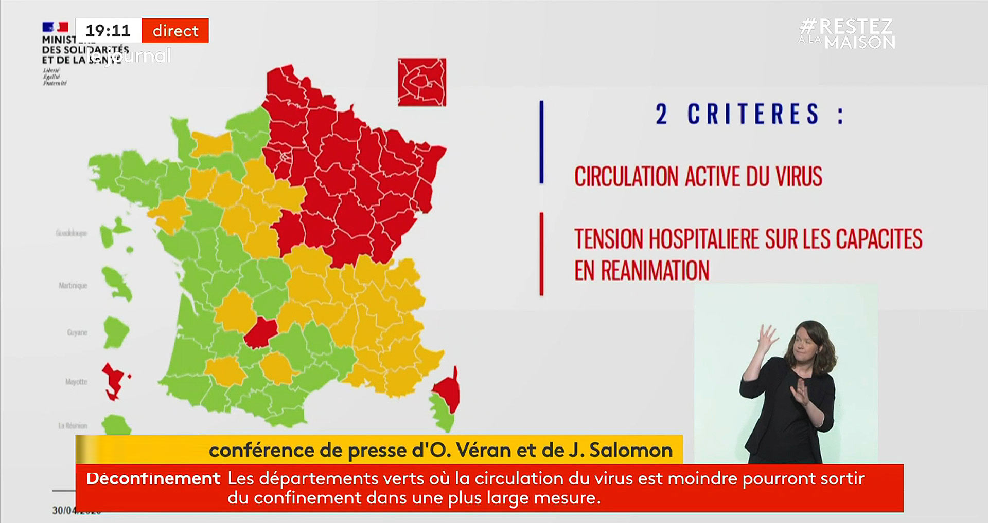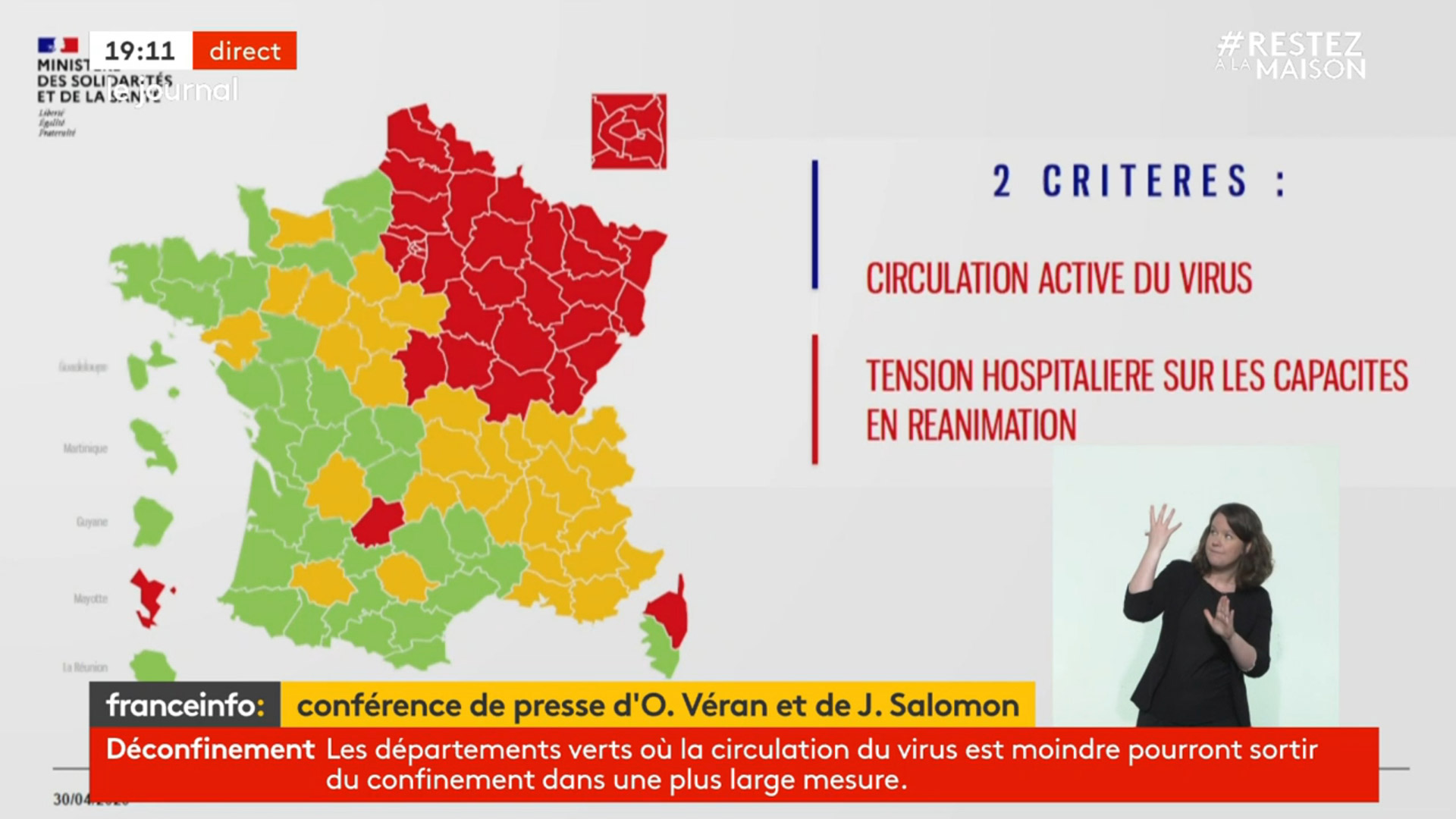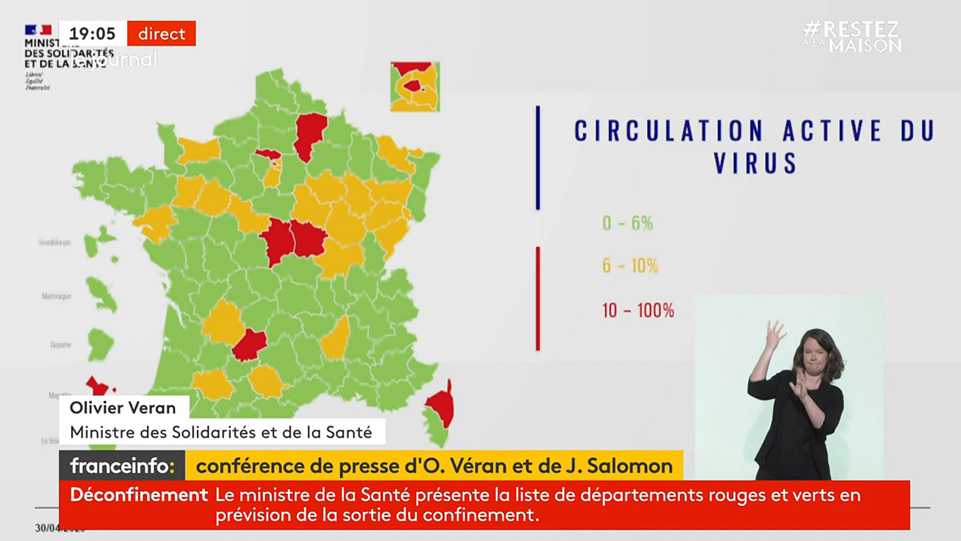 #Coronavirus #Covid19: La Version provisoire de la Carte de France du Déconfinement - Cette Carte a été dévoilée par le directeur général de la Santé, Jérôme Salomon, et le ministre de la Santé, Olivier Véran, ce jeudi 30 avril 2020. Elle sera mise à jour régulièrement, certains départements pouvant basculer du vert au rouge et vice-versa. Elle était attendue. Le directeur général de la Santé, Jérôme Salomon et le ministre de la Santé, Olivier Veran, ont rendu publique, jeudi 30 avril, une première carte dévoilant les fameux départements verts, où le coronavirus circule moins, et les rouges, où l'épidémie est la plus répandue. Sans surprise, on constate que tout le nord-est de la France ainsi que l'Ile-de-France sont en rouge, soit 35 départements. La partie centre du pays et le Sud-Est sont en orange, une couleur intermédiaire, et l'Ouest du pays est en vert. "Ces cartographies ne sont que des indicateurs qui guident les décisions, ils sont affinés par d'autres indicateurs", a précisé Olivier Véran.