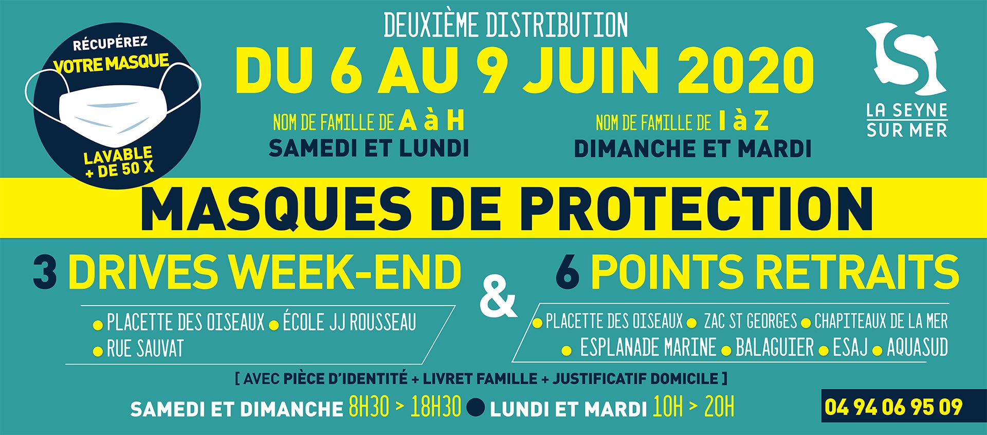 Le Retrait en mode piéton se fait du samedi 06 au mardi 09 juin 2020. Distribution de 1 masque par personne. Preparez votre pièce d’identité – justificatif de domicile - Livret de famille (si enfants). • Samedi 08h30-18h30 - Noms de famille de A à H • Dimanche de 08h30-18h30 - Noms de famille de I à Z • Lundi 10h00 – 20h00 - Noms de famille de A à H • Mardi 10h00 – 20h00 - Noms de famille de I à Z. ... Lieux: • ESAJ – Avenue Yitzhak Rabin, • Esplanade Marine – Site des anciens chantiers navals, • Espace Circoscène – Les Sablettes, • Maison Intergénérationnelle St Georges – 206, Rue du Domaine Saint Georges • Parking Musée de Balaguier – Corniche Bonaparte • Parking Piscine Aquasud – avenue de Rome.