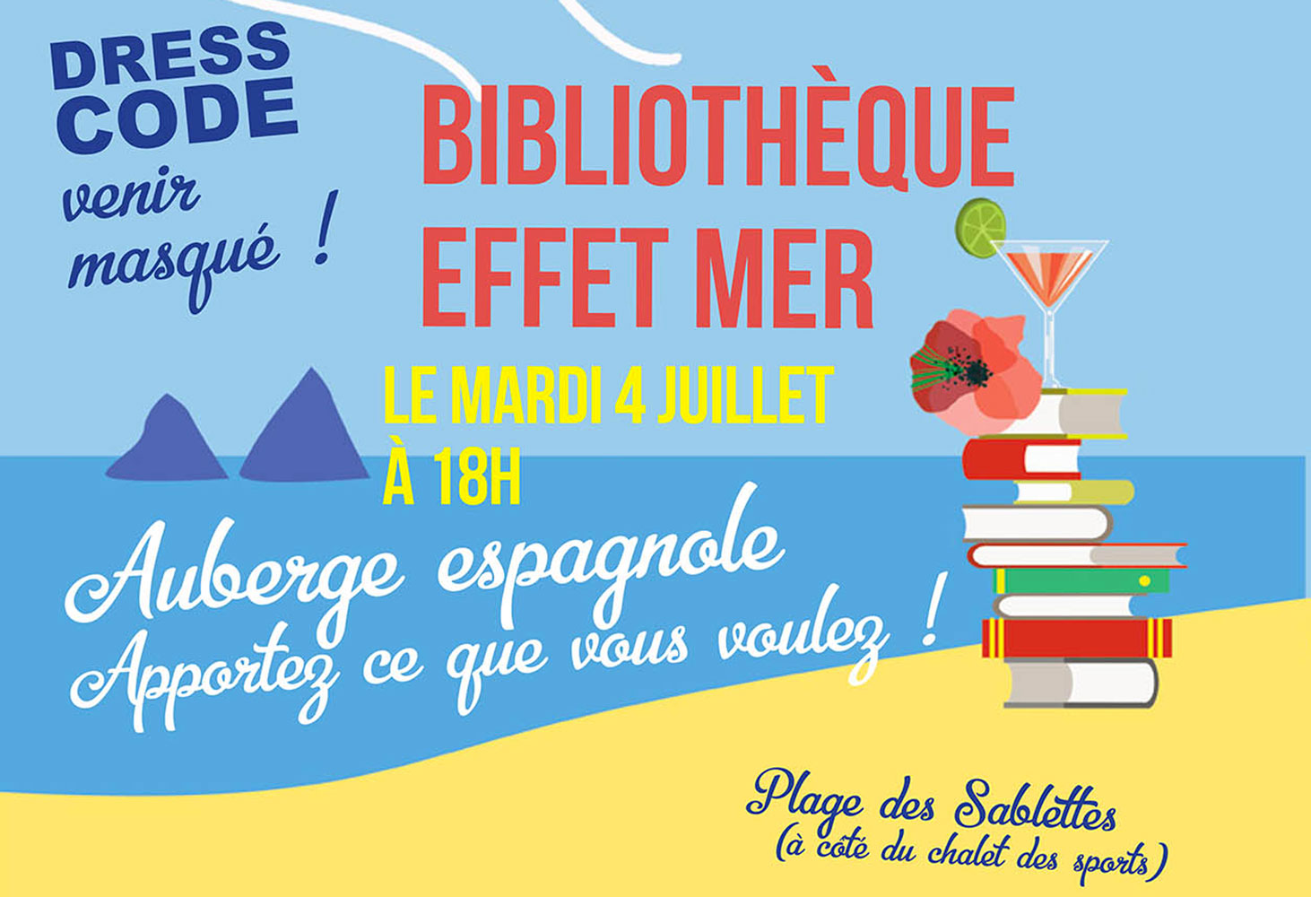 Les habitués vont se réjouir, car du mardi au vendredi, la plage des Sablettes retrouve sa bibliothèque Effet mer de 09h30 à 18h00. La presse du jour à parcourir dans la quiétude du matin, les contes et ateliers les jeudis et vendredis matin, les animations multiples (en partenariat avec les « Petits débrouillards »), et les surprises que les bibliothécaires vous réservent, sont autant de moments forts à ne pas rater. Rendez-vous mardi 04 juillet 2017 à 18h00 pour une traditionnelle auberge espagnole. La consigne : venir masqué !