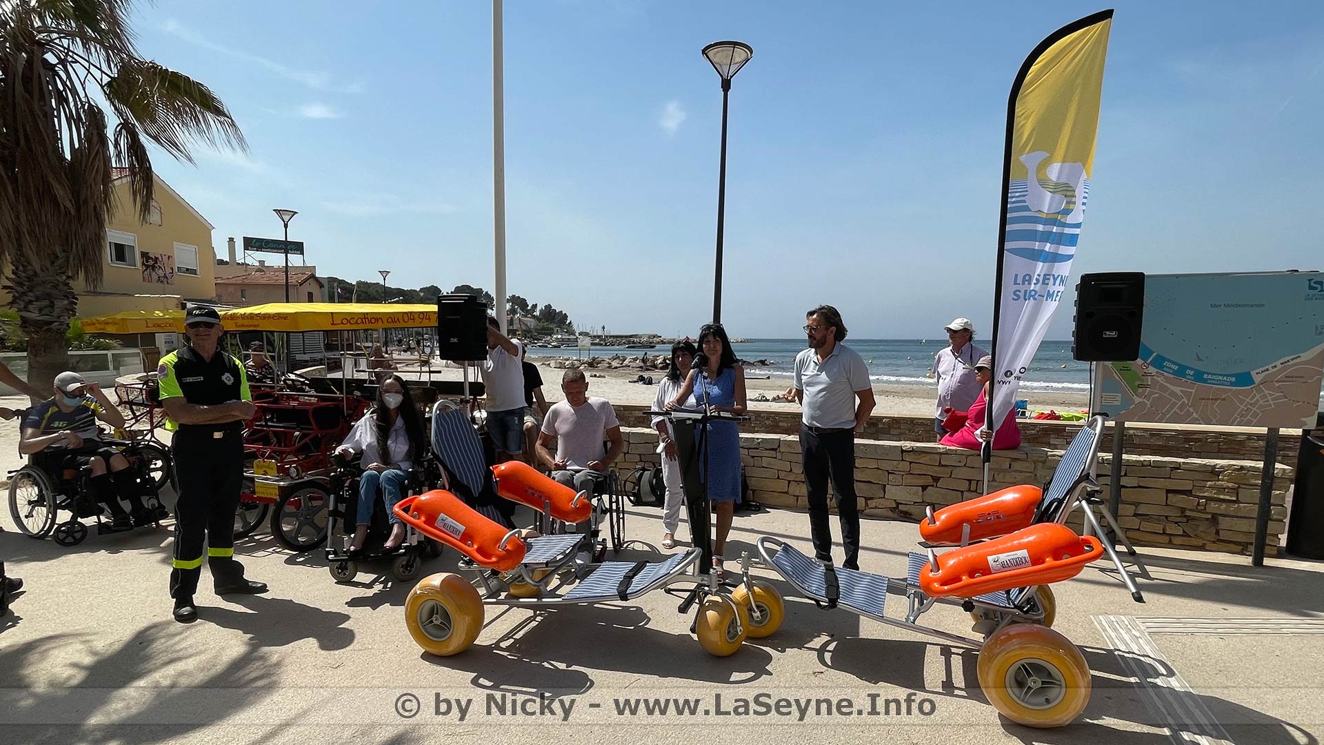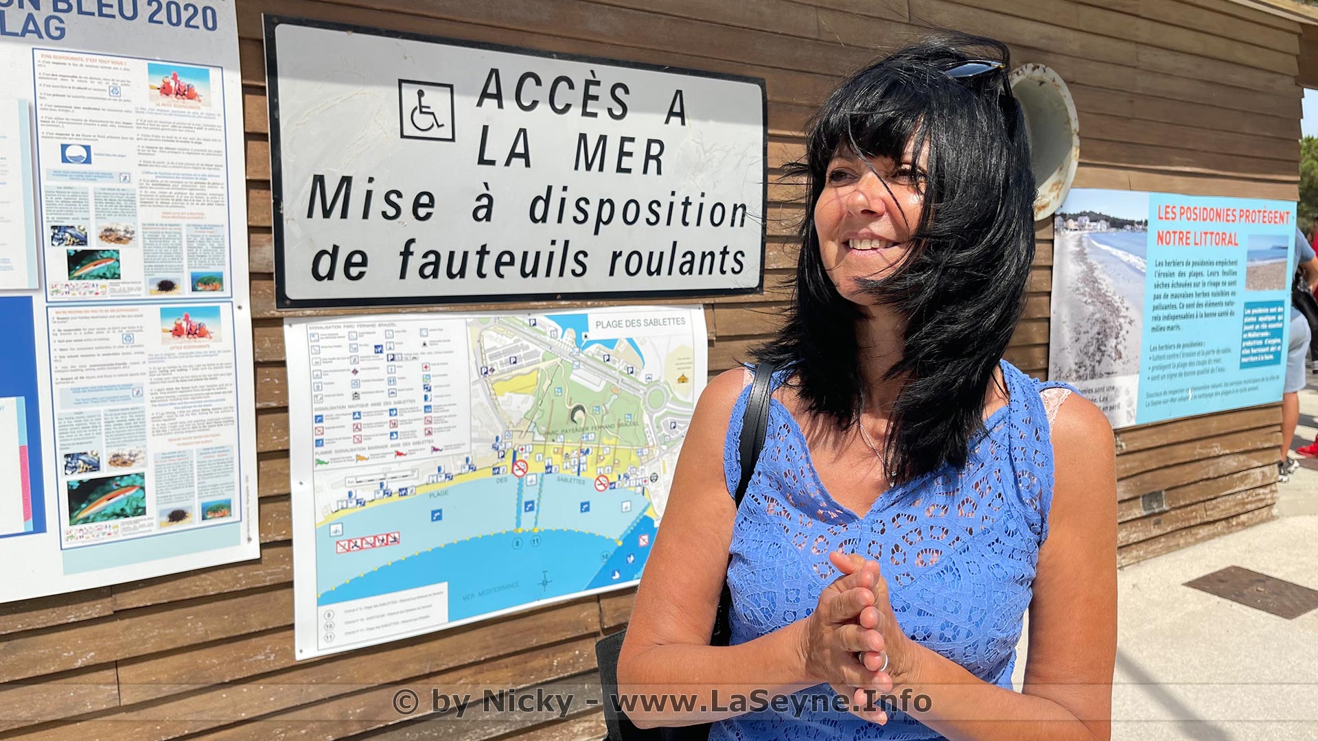 La Déléguée au handicap, Valérie Guittienne rappelle l’investissement de la Ville pour les Personnes à mobilité réduite (PMR): places de stationnement réservées régulièrement contrôlées par la PM, ligne de guidage pour les déficients visuels, et tapis de mise à l’eau neuf: « L’accueil handiplage n’aura jamais été aussi efficace ! » ... « Aujourd’hui, chacun peut se baigner en toute sécurité. Je salue l’engagement des Secouristes de La Seyne Tamaris qui, sans rendez-vous, vont accueillir les PMR du 1er juillet au 31 août de 10h00 à 19h00 ». A ses côtés, Xavier Margier, le chef d’équipe, confirme: « Si le temps le permet, nous aidons la personne à prendre place dans le fauteuil, l’amenons au plan d’eau et venons la rechercher ». L’an dernier, trois à quatre personnes empruntaient quotidiennement la mise à l’eau. Deux secouristes et un employé communal saisonniers assurent l’accueil. (On notait également la présence de Nathalie Soriano, déléguée au tourisme, et de Sophie Montbarbon, déléguée à la santé).
