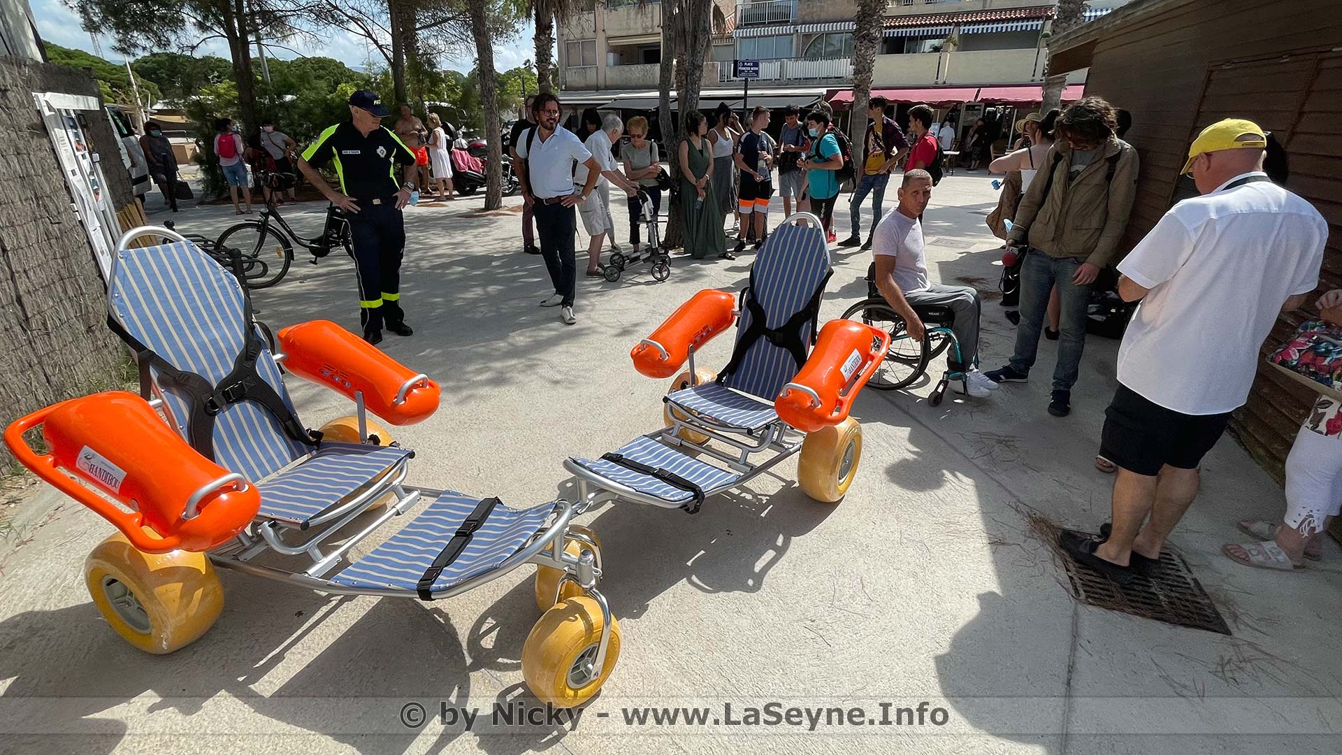 Saint-Elme: Deux Fauteuils amphibies Mobi-Chair pour les Personnes à Mobilité réduite (PMR) - Ce 18 juin 2021, deux nouveaux fauteuils Mobi-chair ont été offerts à la Ville par l’association Handibou. Un outil pour les bénévoles secouristes de La Seyne Tamaris qui accompagnent à l’eau les personnes handicapées depuis le poste de secours de St-Elme, du 1er juillet au 31 août, de 10h00 à 19h00 non stop.