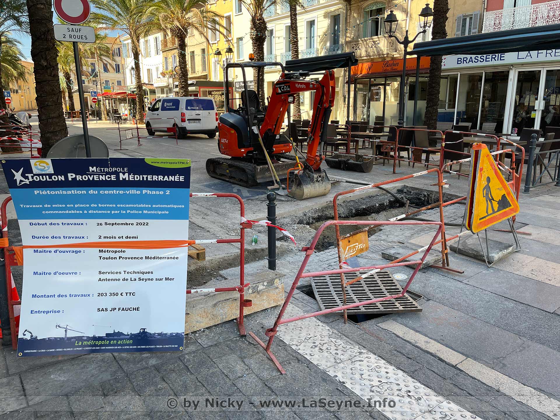 Centre-Ville: Lancement des Travaux d’Installation de Bornes automatiques escamotables, le 30/09/2022 - Dans le cadre du centre-ville sans voiture, Nathalie Bicais, Maire de La Seyne-sur-Mer, a le plaisir de vous convier au lancement des travaux d’installation de bornes automatiques escamotables, vendredi 30 septembre à 10 heures, avenue Hoche (devant la brasserie de La Frégate). • PÉRIODE DE TRAVAUX: DU 26 SEPTEMBRE À MI-NOVEMBRE 2022 •
