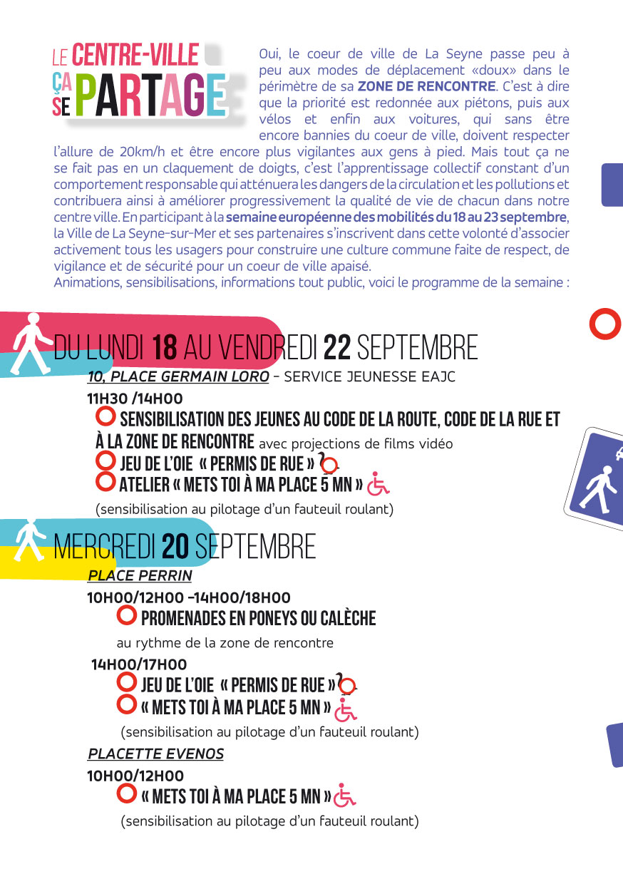 Développement durable: Semaine européenne de la Mobilité 2017 à La Seyne sur Mer ... Cette manifestation se décline chez nous du 18 au 23 septembre 2017 autour d'un slogan porteur « Le centre-ville ça se partage ». Où l'art et la manière de faire coexister dans une même zone piétons, voitures et deux roues. Evidemment, pour qu'un tel concept prenne corps les usagers doivent se l'approprier en n'y voyant pas des mesures coercitives mais l'opportunité de rendre la circulation plus sûre. Une « simple » question de cohabitation -qui peut prendre du temps à se réaliser- mais qui au final sert les intérêts de chacun : se déplacer en toute sécurité, moins de pollution et une meilleure qualité de vie dans le centre-ville ... « Les gens doivent s’y sentir bien, se rencontrer dans un environnement agréable, et pour cela nous devons arriver à ce qu’il y ait moins de voitures. Les piétons sont chez eux, les voitures sont tolérées » ...