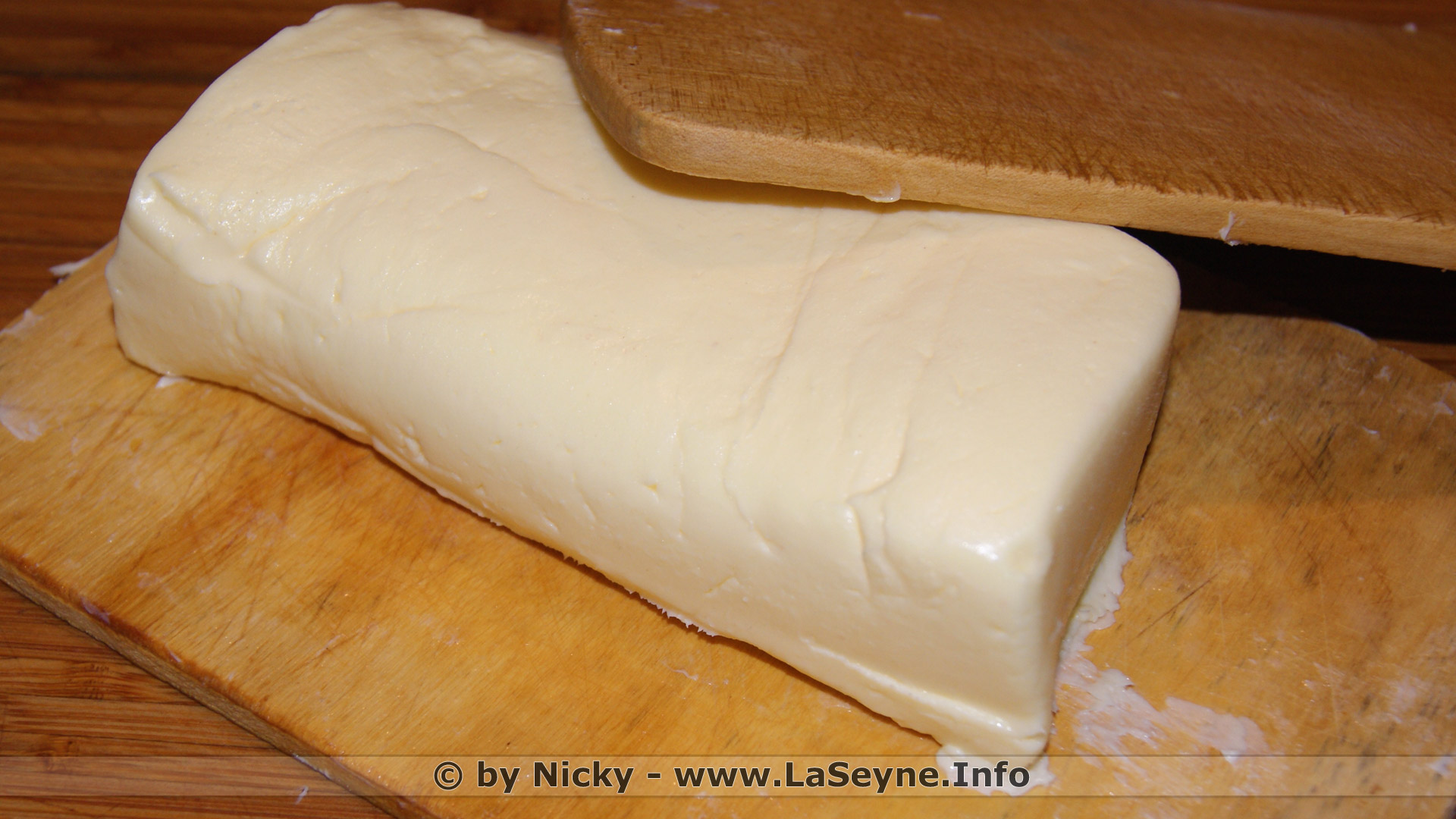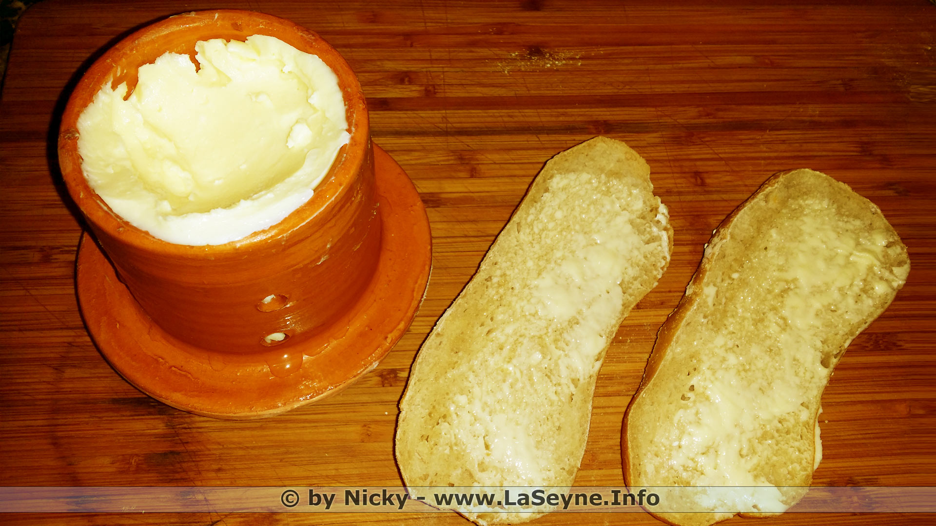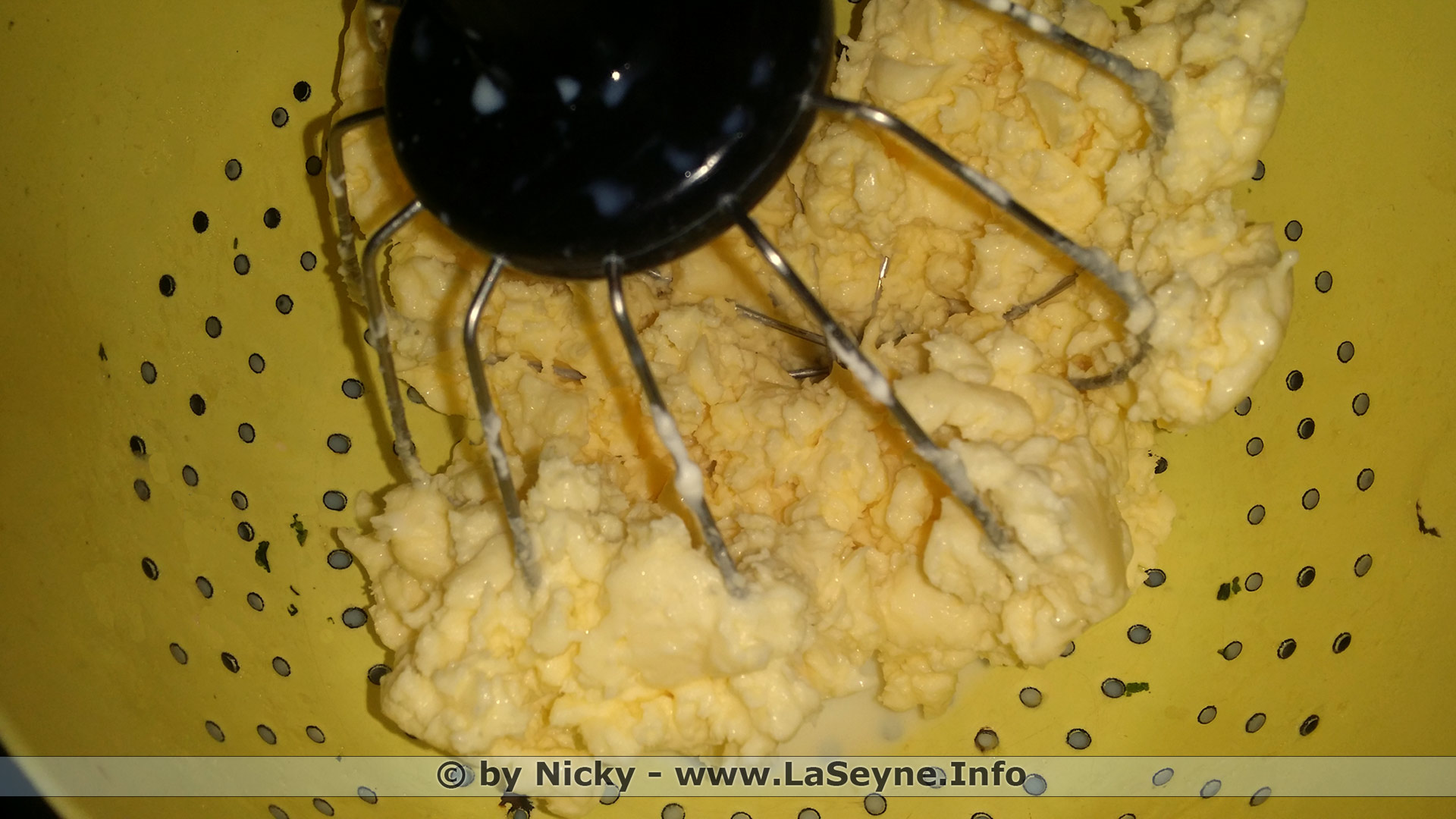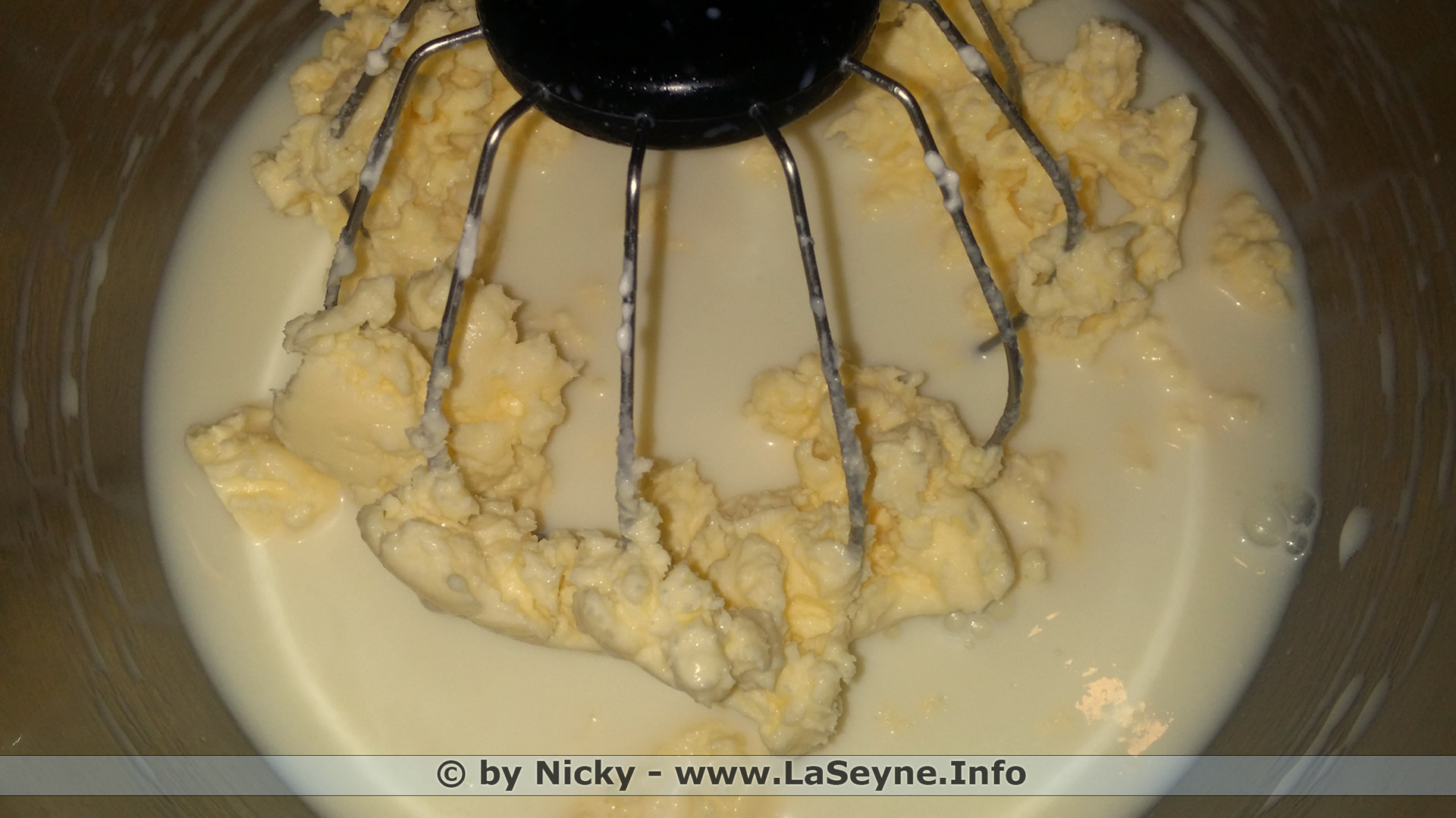 Réalisation: ... Verser un litre de crème entière dans le bol en acier de votre robot pâtissier ... ajouter le sel de mer ... battre la crème avec le fouet du robot en chantilly jusqu'au moment où le beurre et le babeurre se séparent ... placer une passoire dans un cul de poule ... récupérer le beurre et bien le rincer à l'eau fraîche ... battre le beurre pour évacuer le surplus d'eau ... le mettre en forme ou utiliser comme ici un beurrier à eau ... (garder précieusement le babeurre pour faire des crêpes, du pain moelleux, des buns pour burger, en faire un milk-shake avec des fruits frais du Marché, et bien d'autres choses ...)