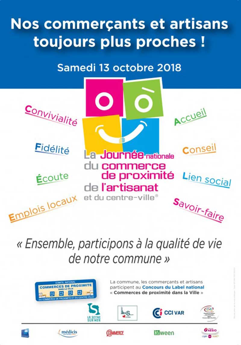 La Journée Nationale du Commerce de Proximité, le Sam 13/10/2018 à La Seyne - Il s'agit d'une animation nationale à laquelle la Ville de La Seyne participe pour la 2e année consécutive. L'objectif de cette journée est de rappeler à tous l'intérêt que présente le commerce de proximité en terme de lien social, de savoir-faire et c... Les commerçants participants proposeront un accueil convivial en offrant un verre de l'amitié, des dégustations, des démonstrations de savoir-faire ... Des animations sont programmées en centre-ville, il y aura une course d'orientation :